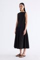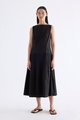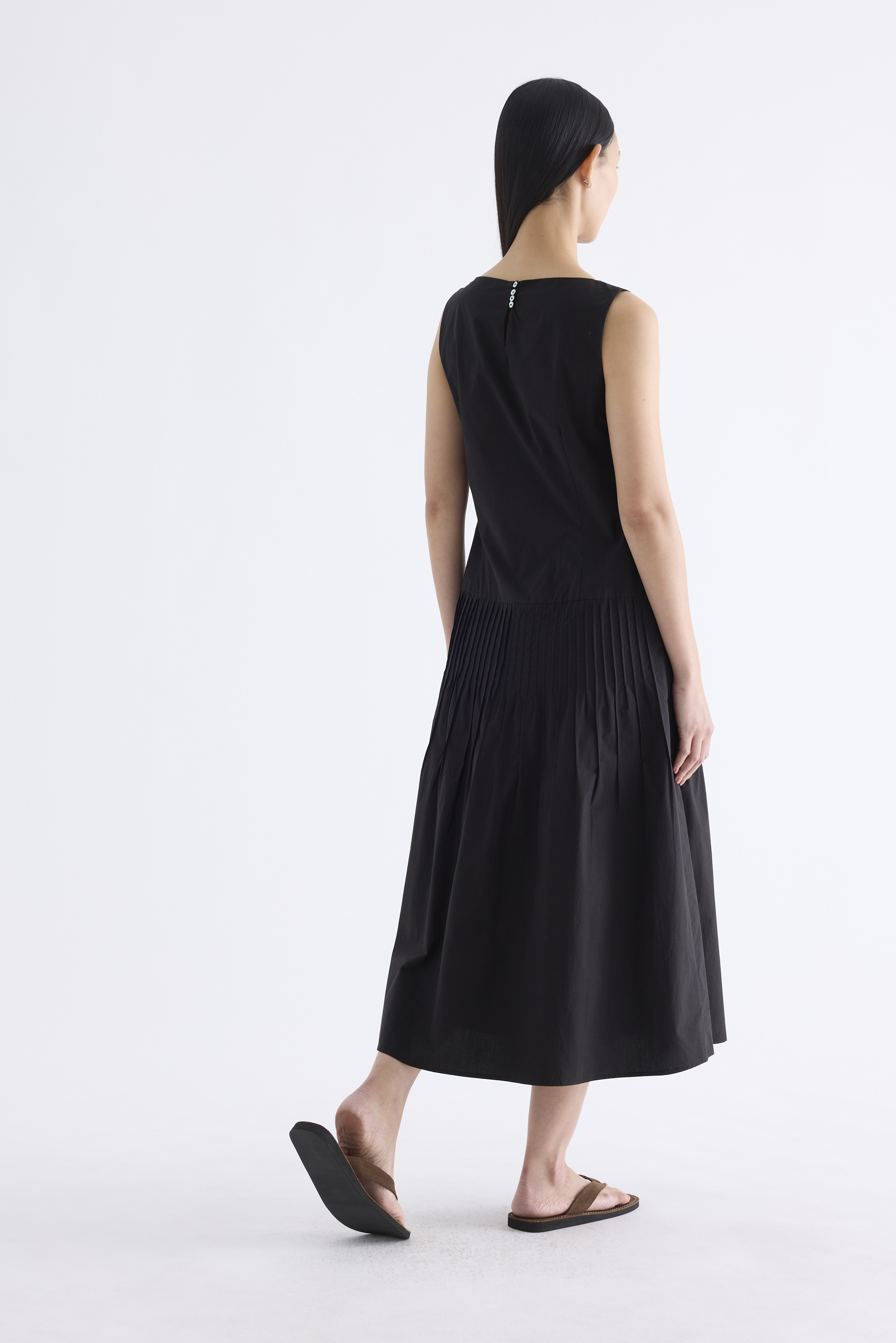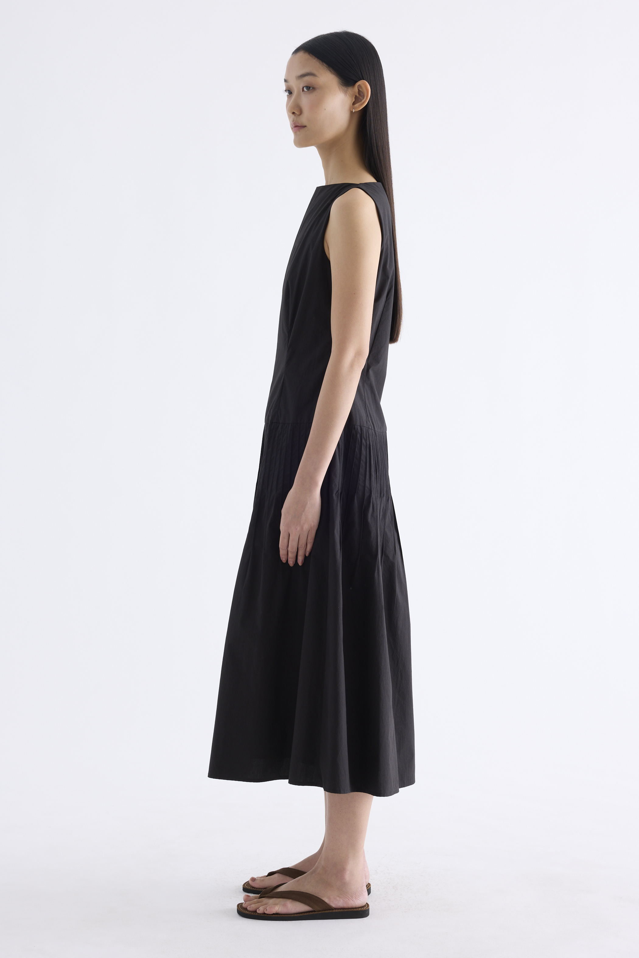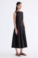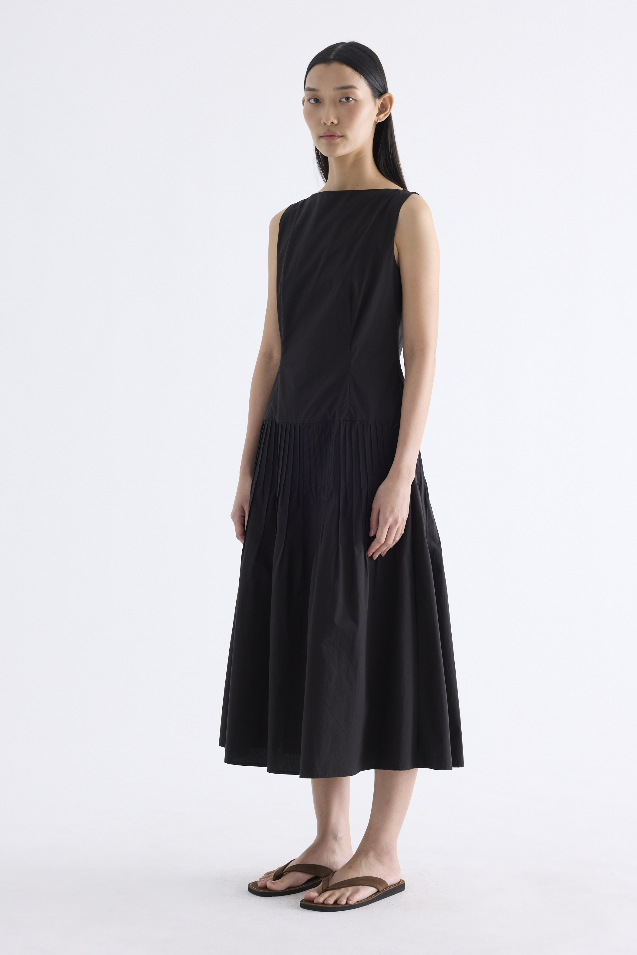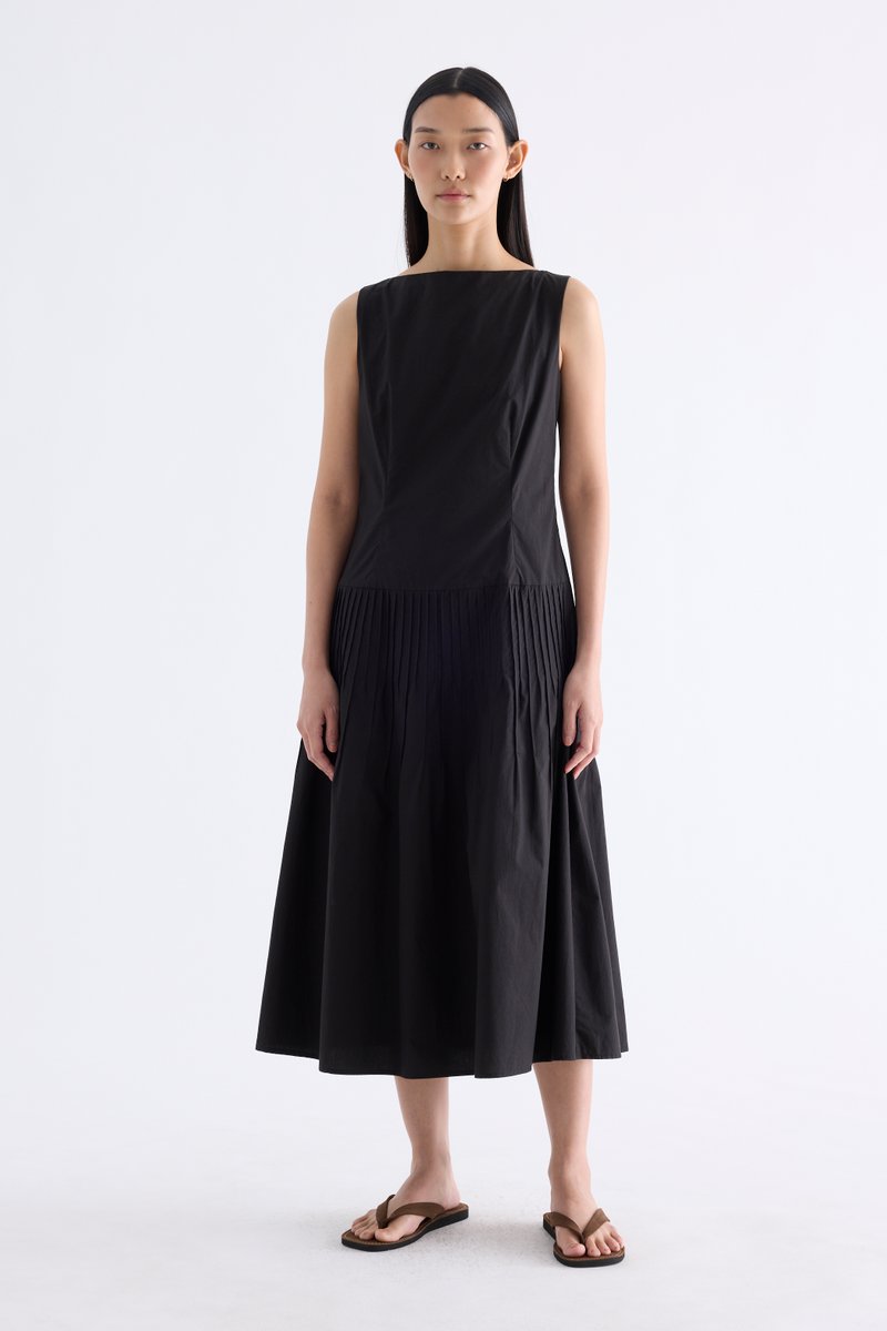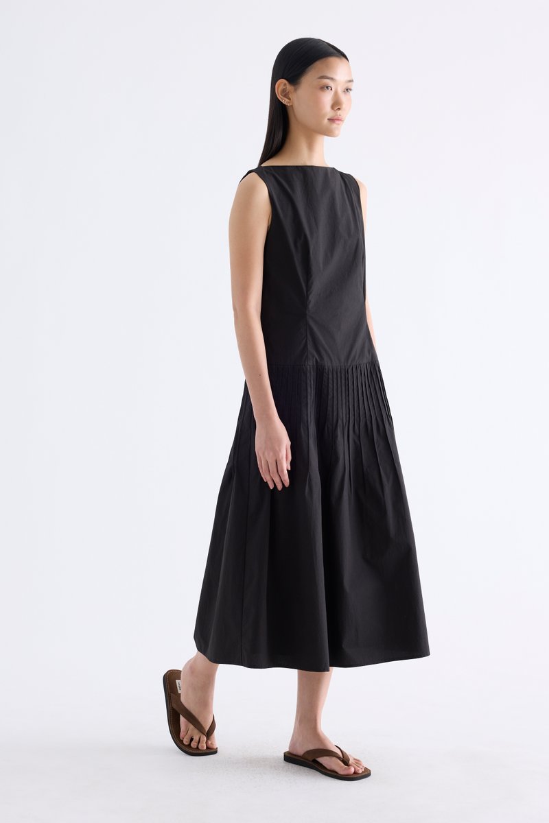Textured. Made from crisp and softly structured cotton, this sleeveless maxi dress features a boat neckline, pleated waist, side zip and buttoned keyhole opening at the back. Worn in an A-line silhouette that fits slimmer at the waist.