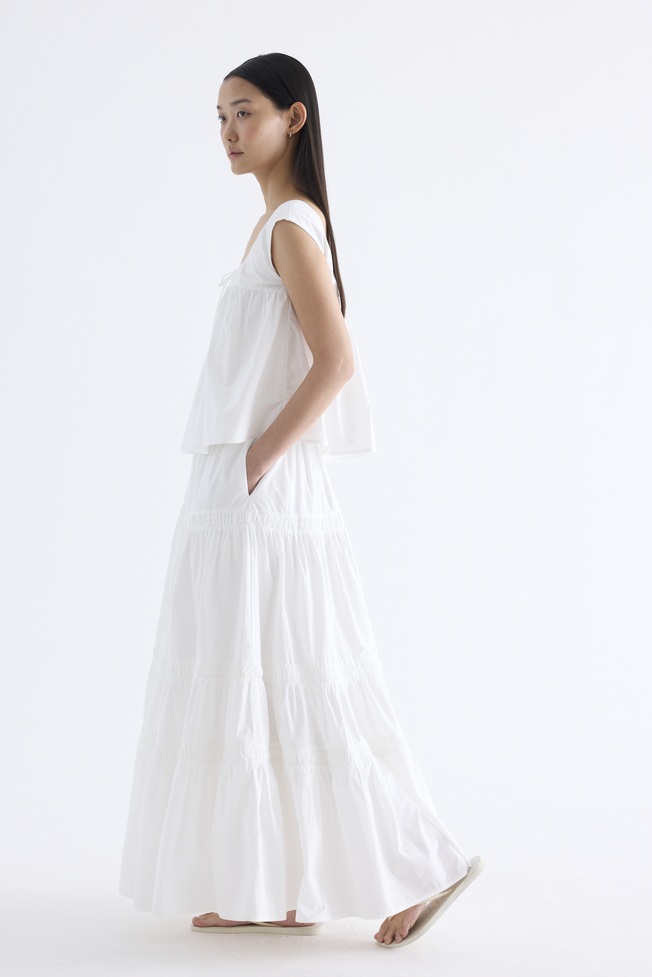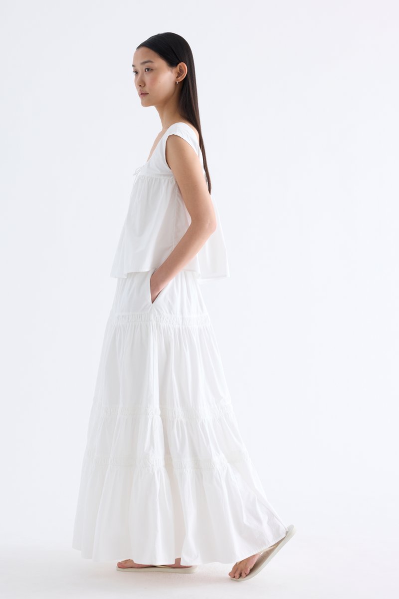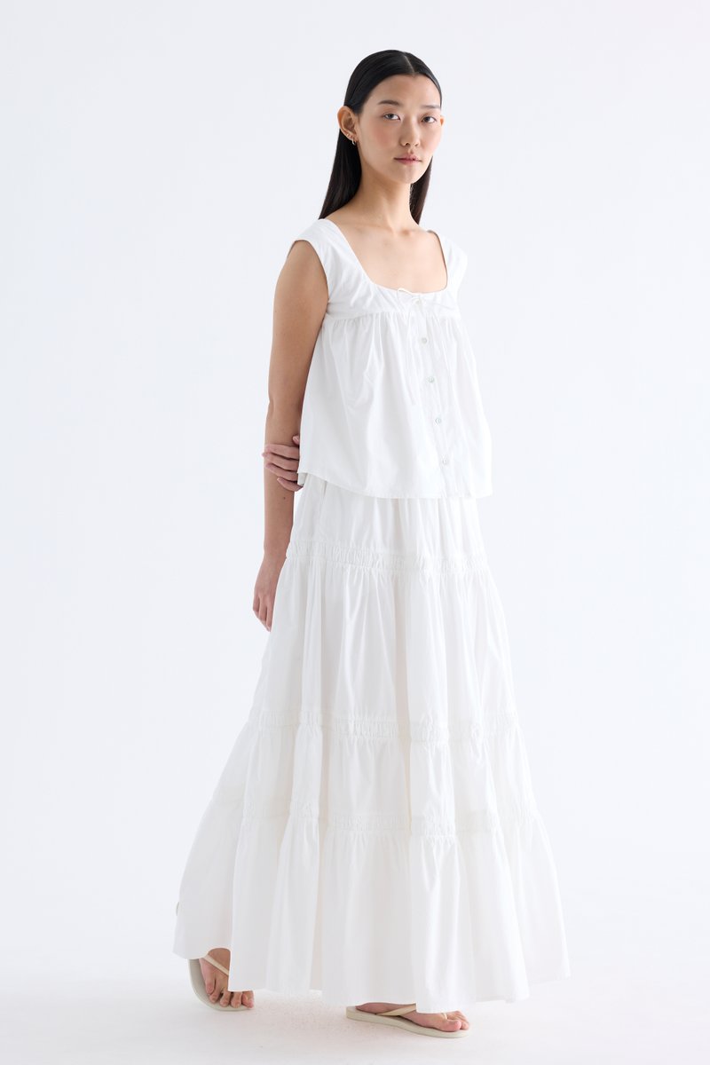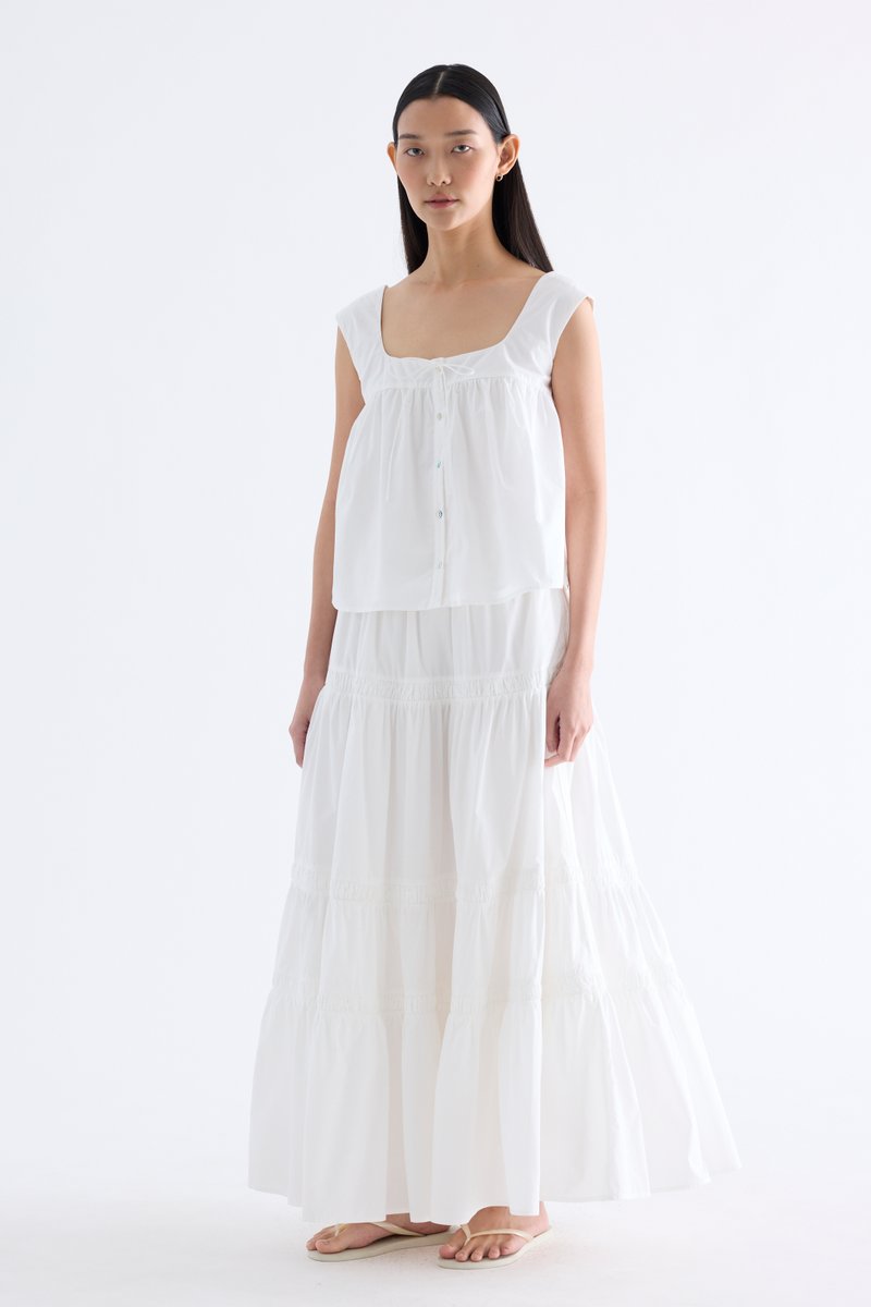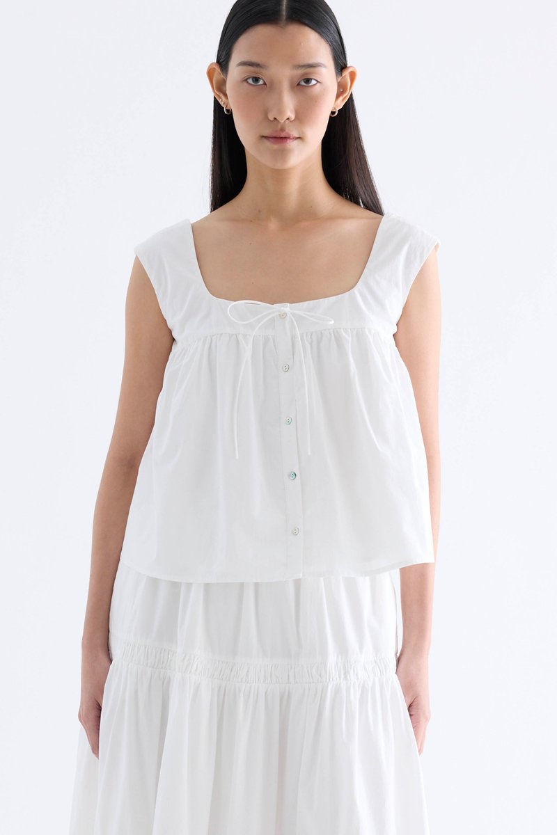 For the love of details. Made from crisp and softly structured cotton, this gathered top features a square neckline with a front tie-strap, cap sleeves and a button-down front. Fits relaxed in a flared silhouette.