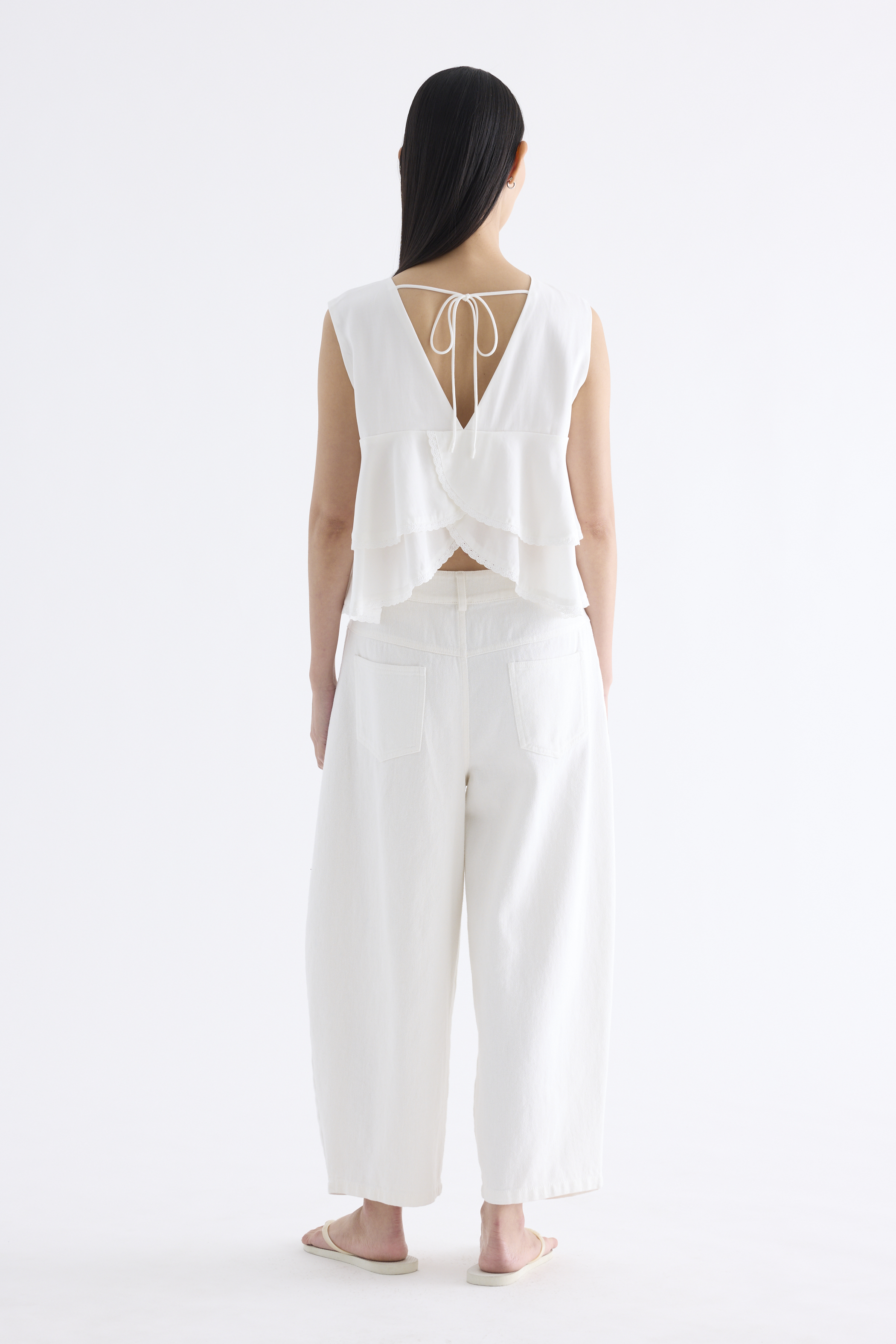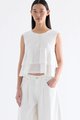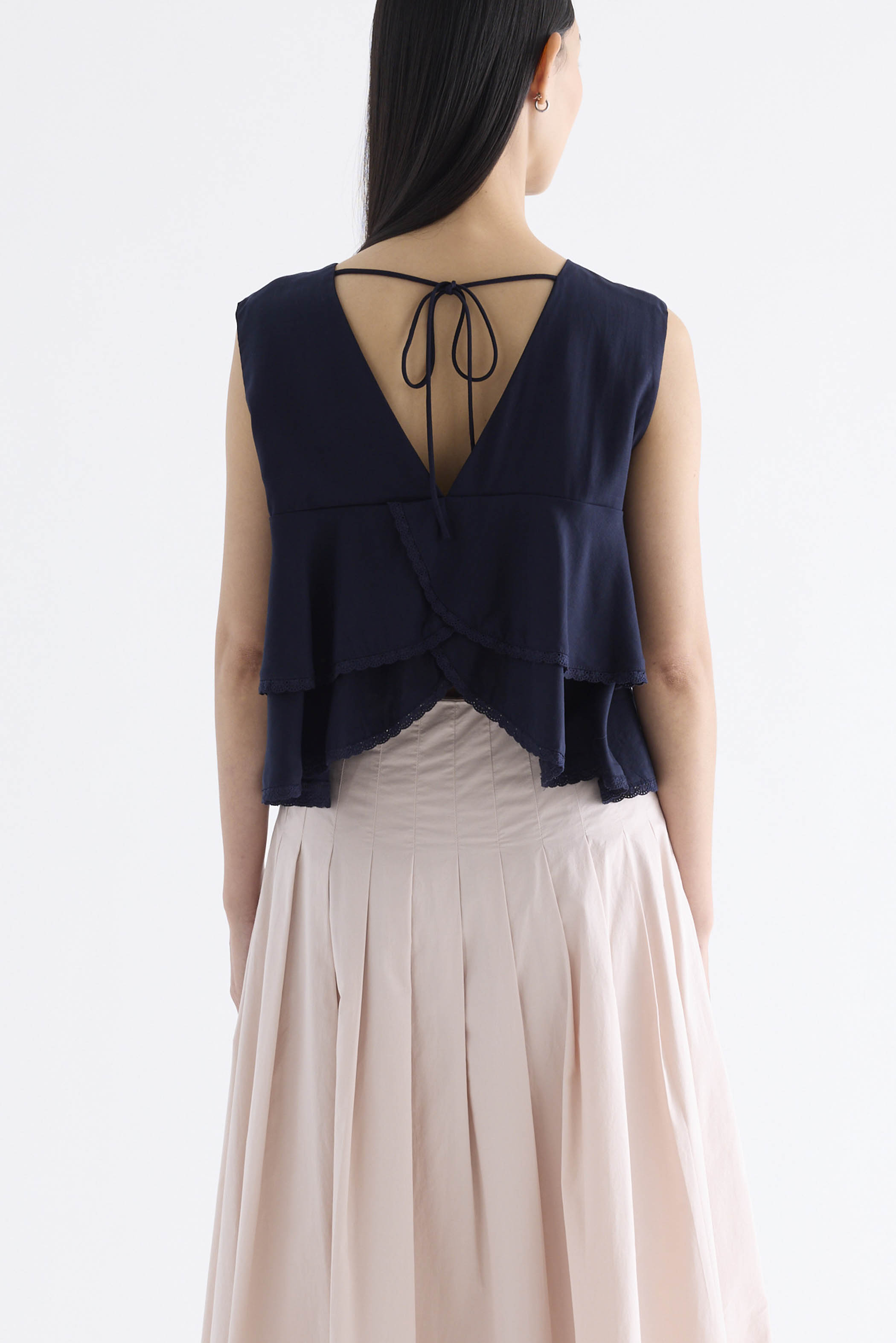 Good moves. Made from smooth and flowy Tencel, this sleeveless top features lace-trimmed tiers, a round neckline, front loop buttons and a V-shaped back opening with a tie-strap closure. Worn in a relaxed, swishy silhouette.