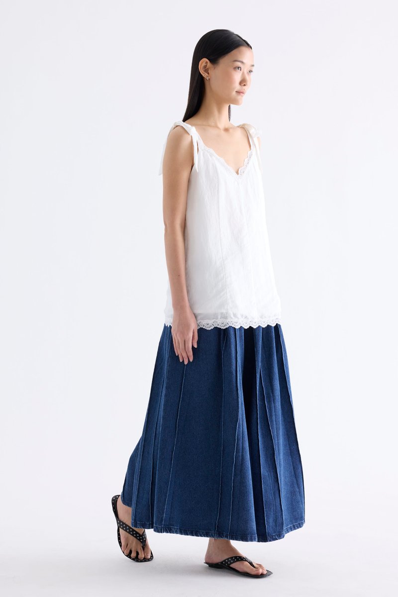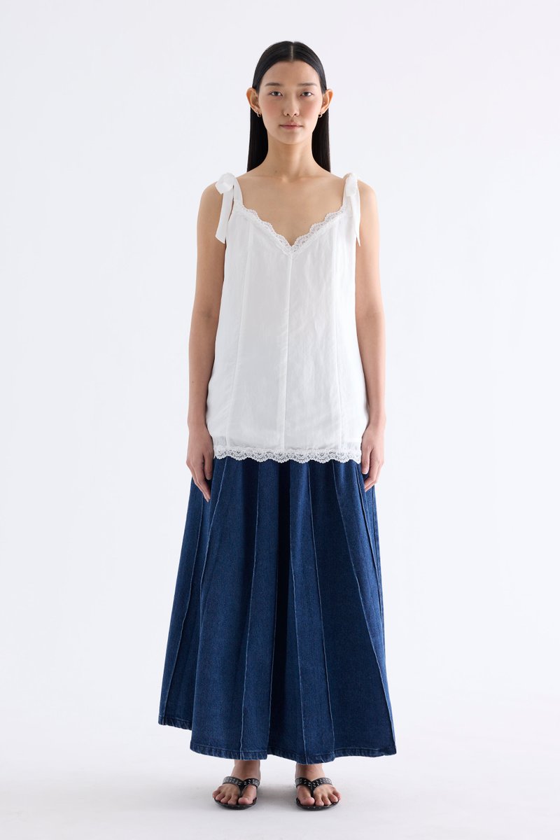 Go to new lengths. Made from light fabric with a soft sheen, this longline slip top features a lace-trimmed V-neckline, self-tying shoulder straps and a panelled construction. Worn in a relaxed fit.
