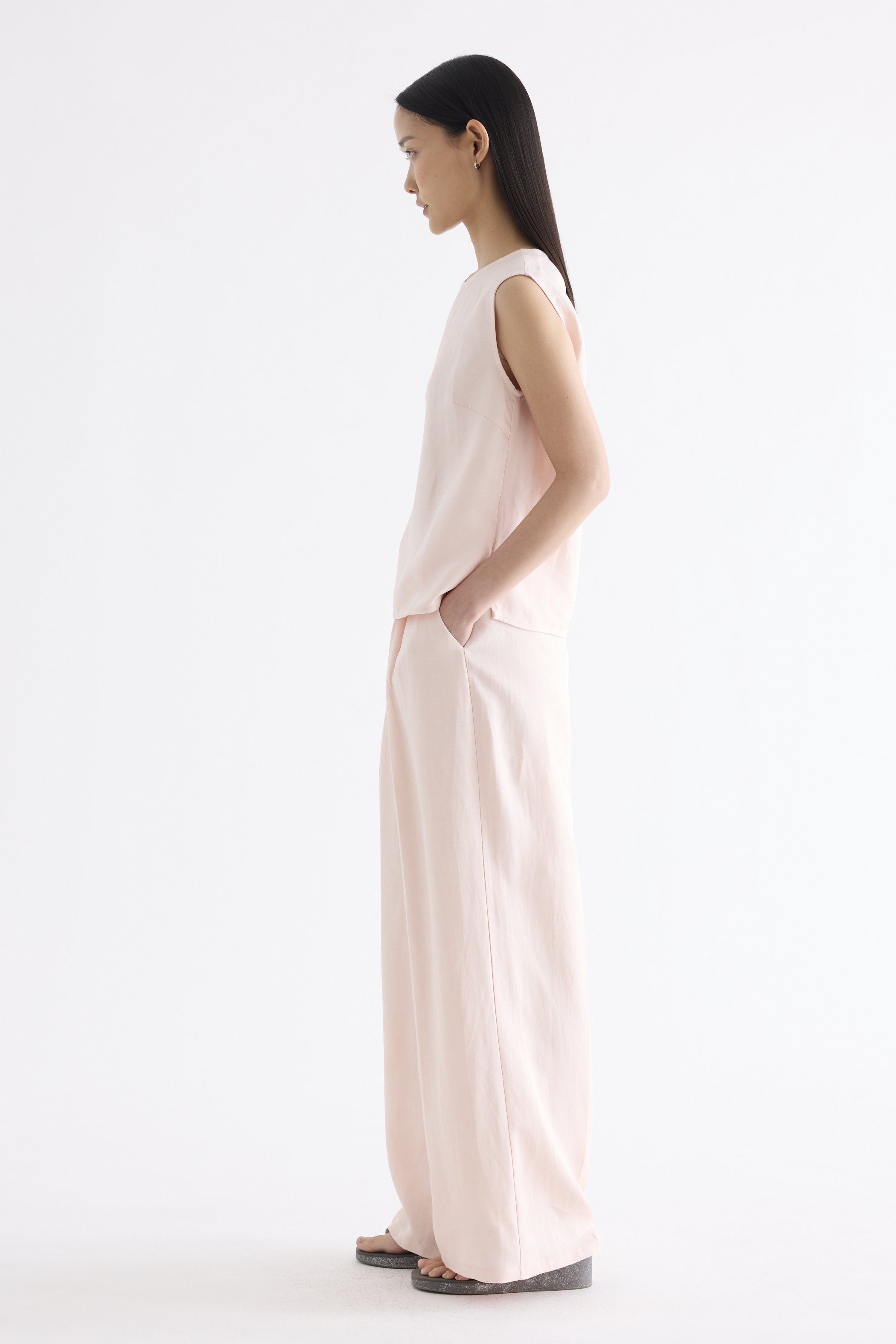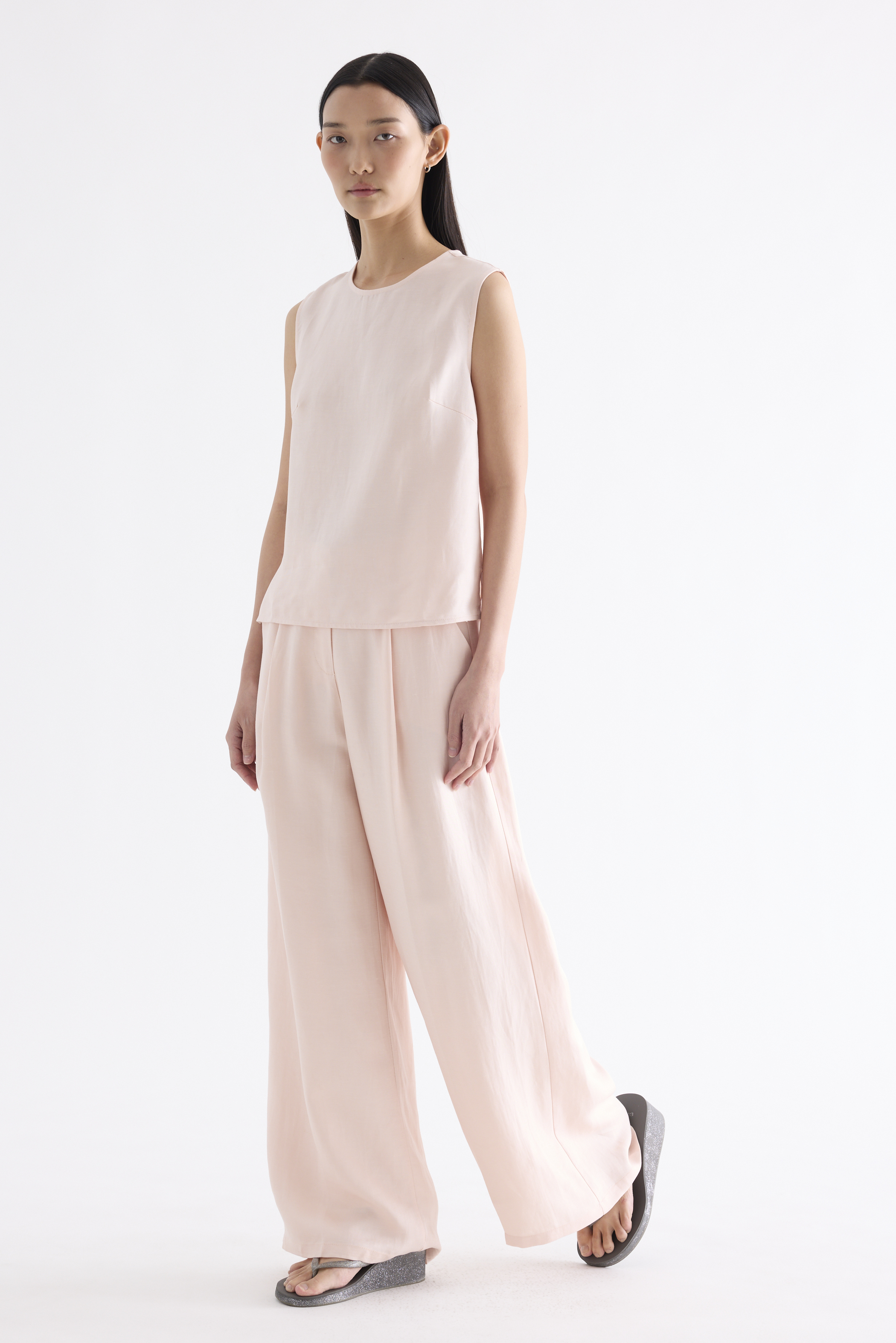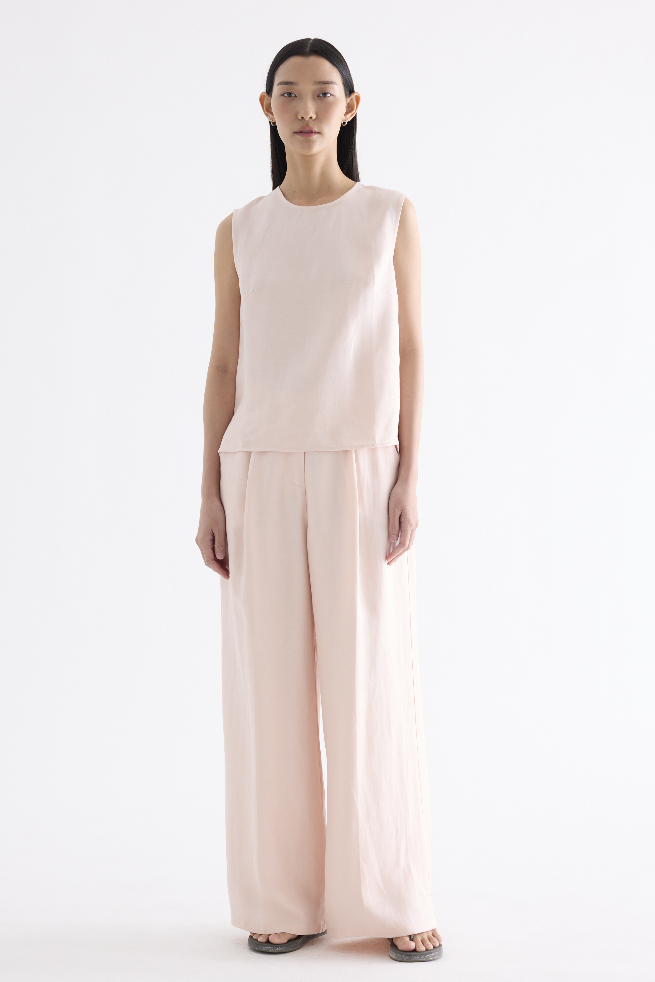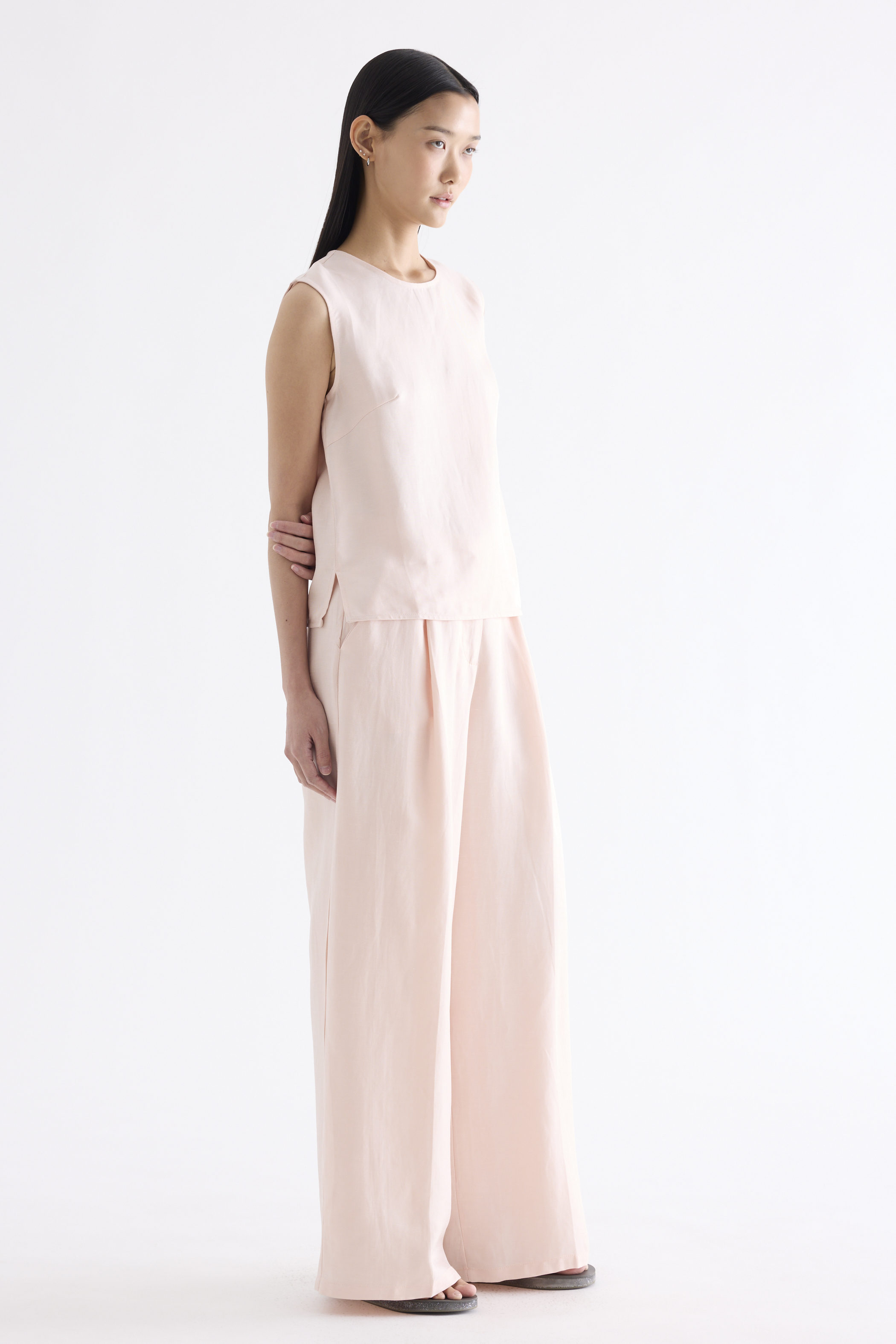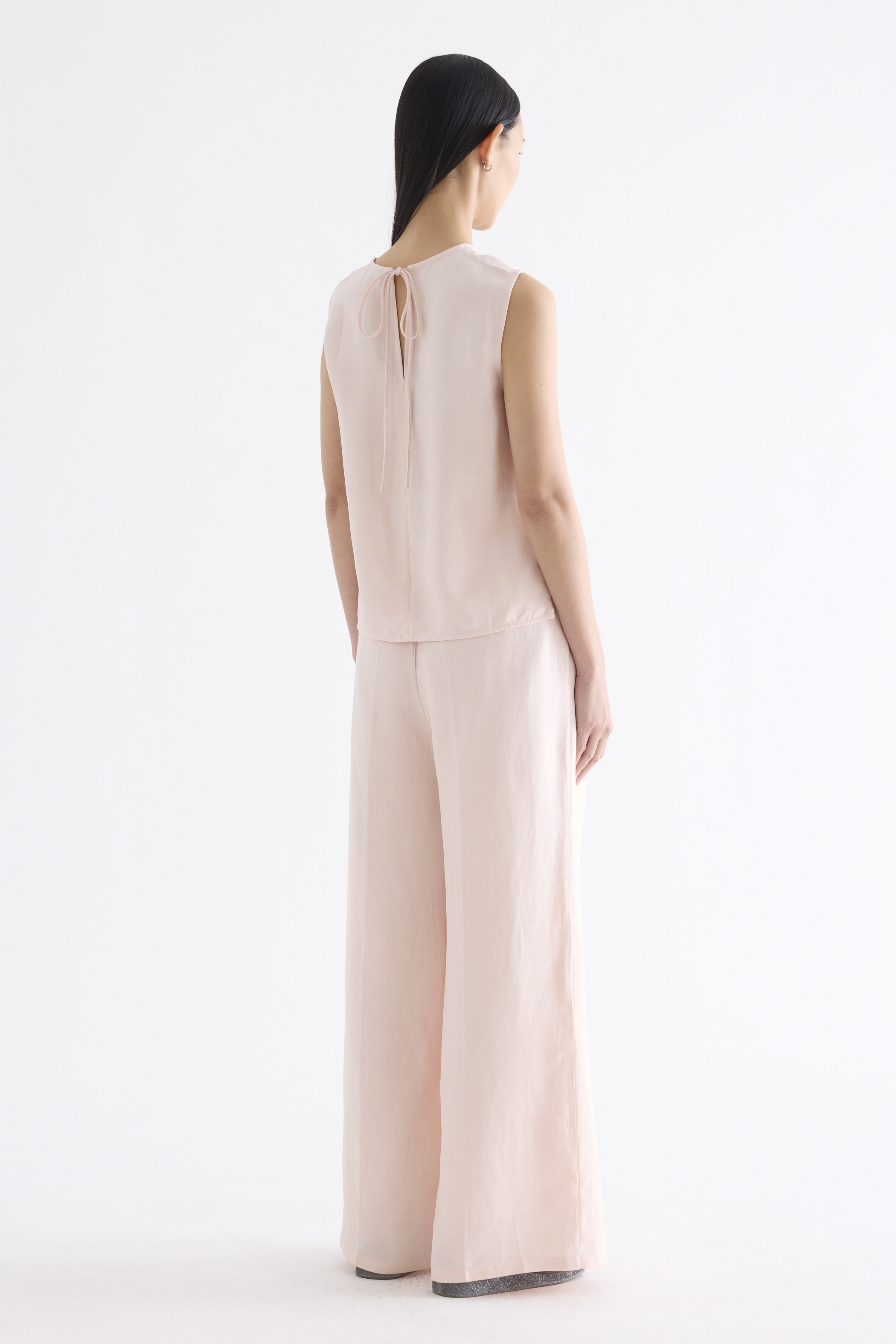 A mix-and-match favourite. Cut from light and softly tailored fabric, this sleeveless top features a round neckline, side splits and a back keyhole opening with a tie-strap closure. Worn in a relaxed fit.