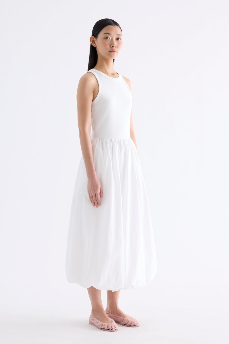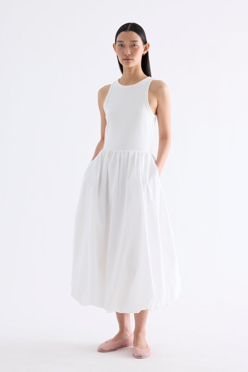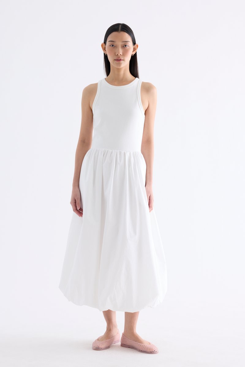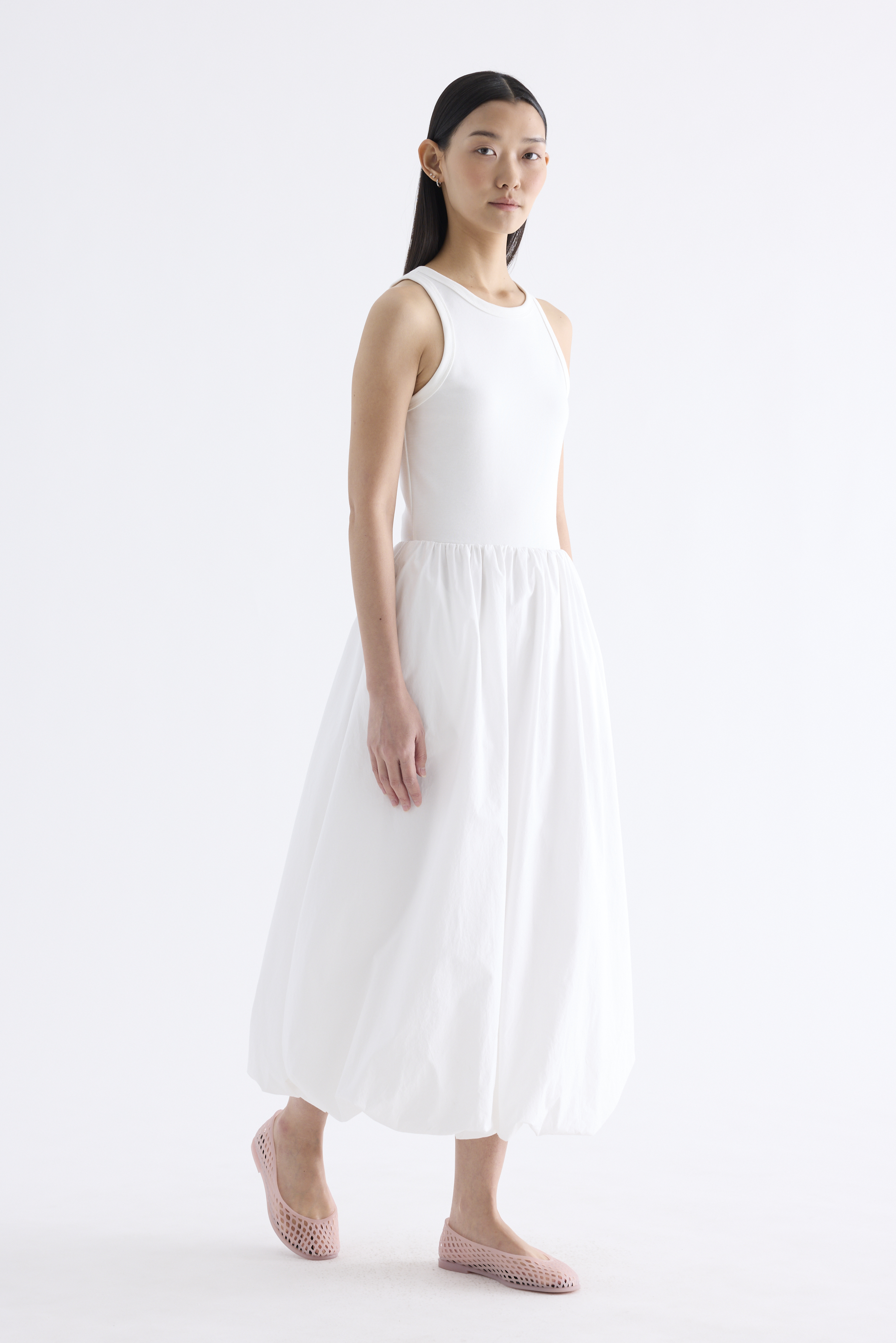 Occasion ready. This maxi dress features a stretchy tank top with a round neckline, a back opening with ribbon tie-strap closures and a bubble skirt cut from crisp, softly structured cotton. Worn in an A-line silhouette that fits slimmer through the bodice before flaring out at the waist.