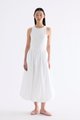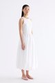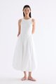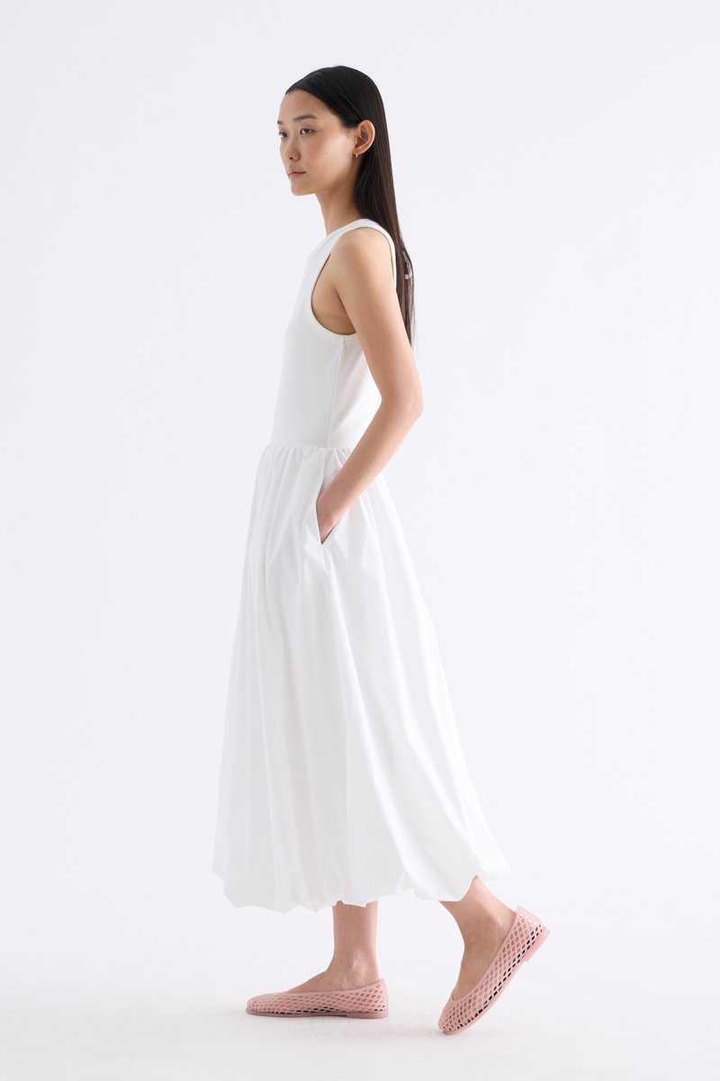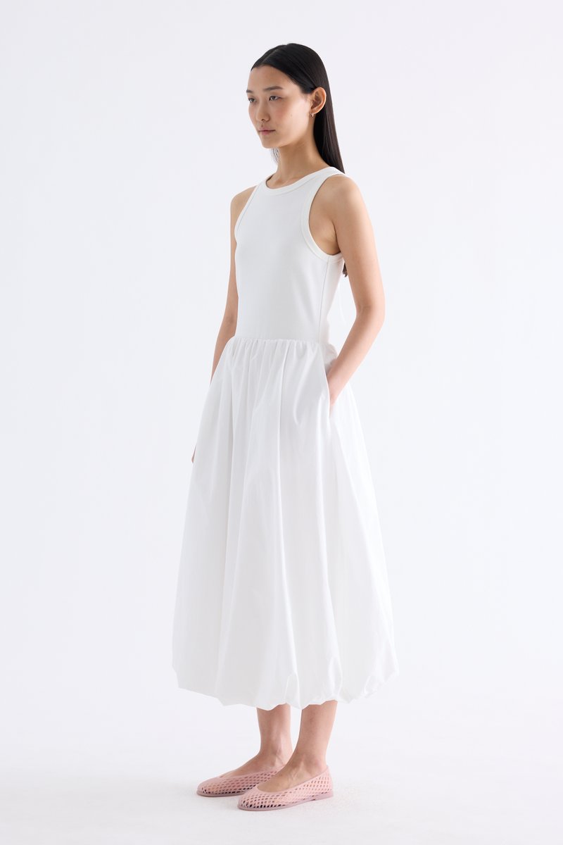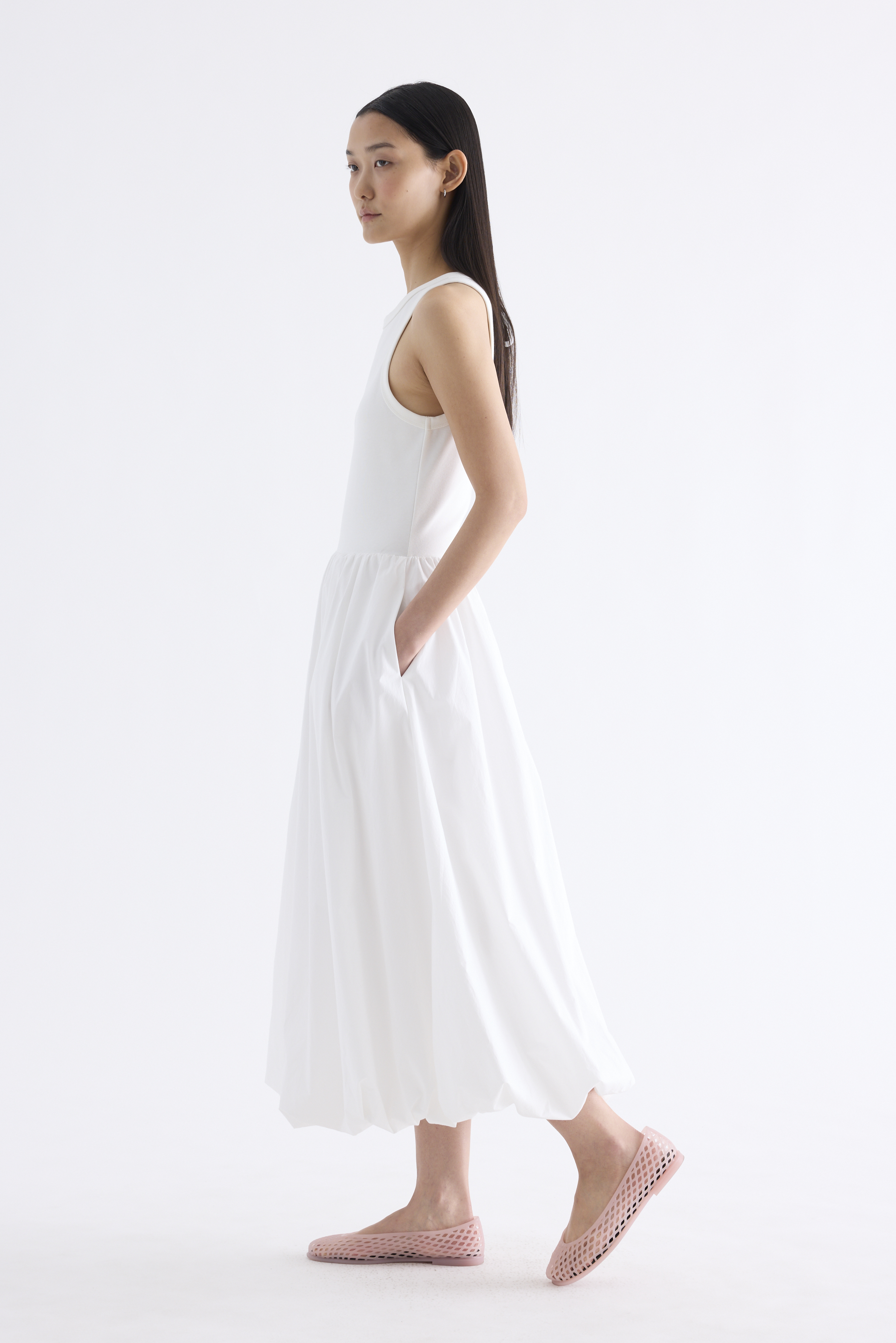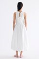 Occasion ready. This maxi dress features a stretchy tank top with a round neckline, a back opening with ribbon tie-strap closures and a bubble skirt cut from crisp, softly structured cotton. Worn in an A-line silhouette that fits slimmer through the bodice before flaring out at the waist.