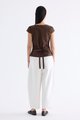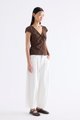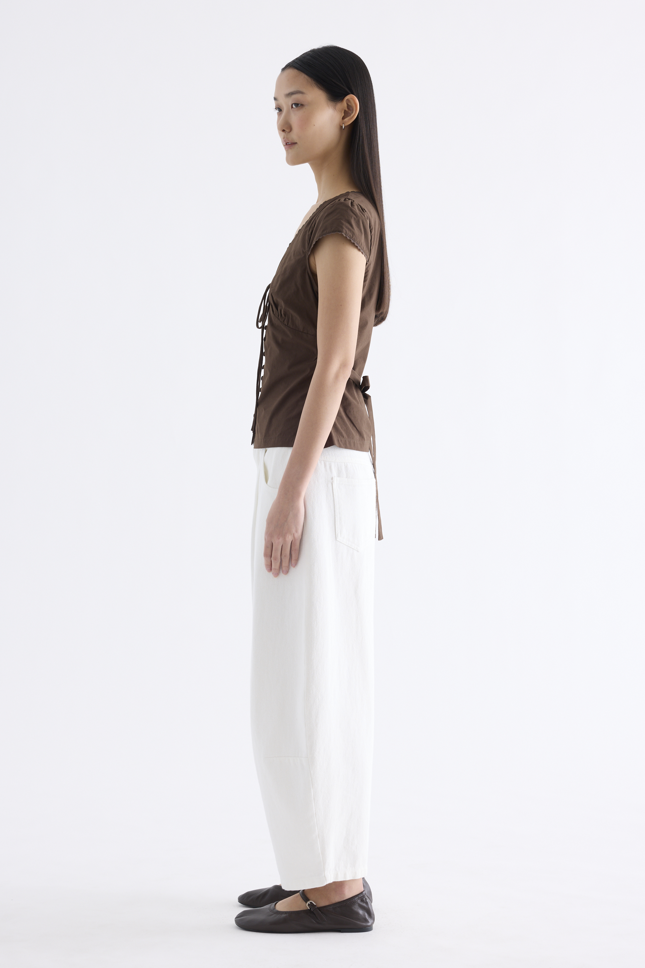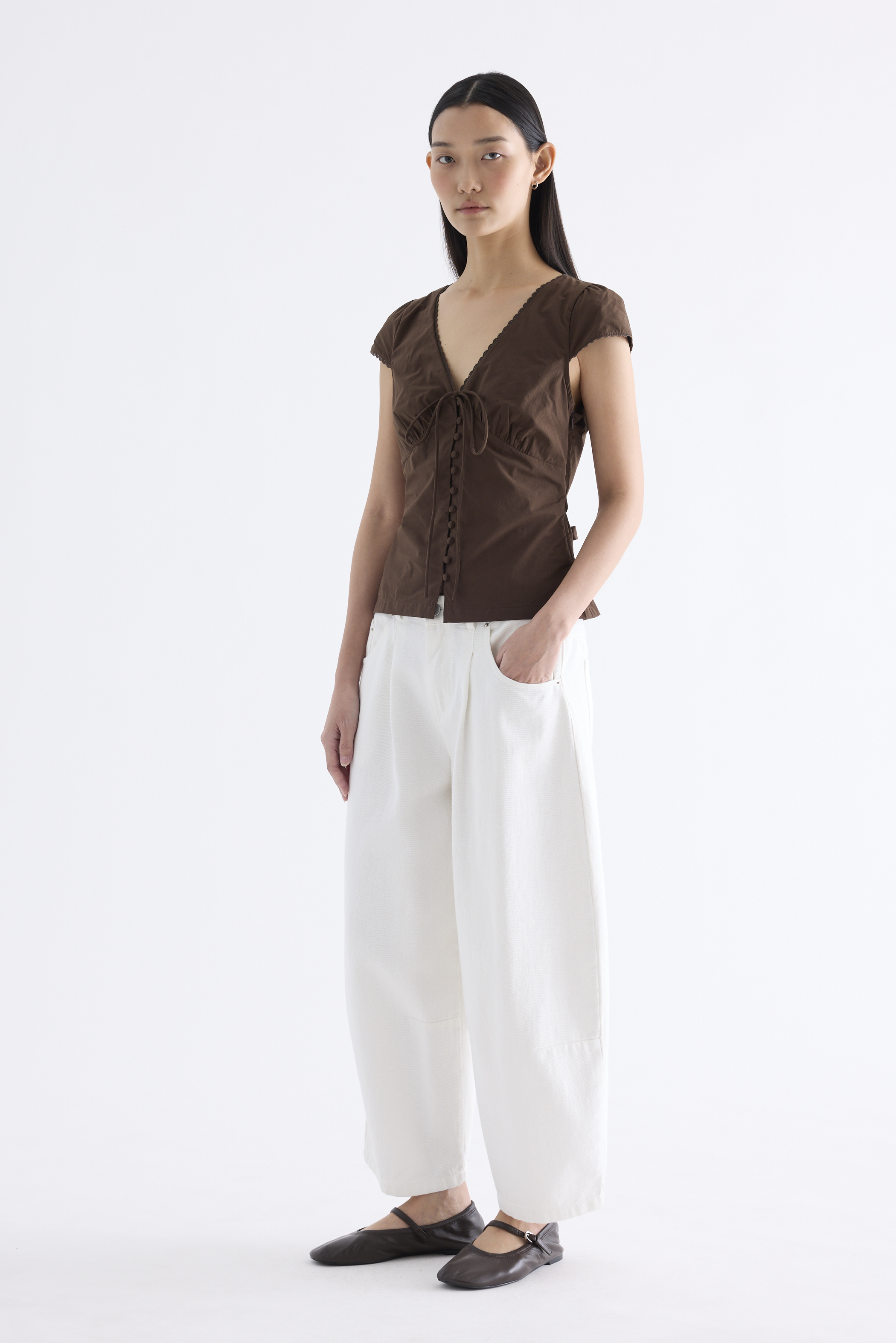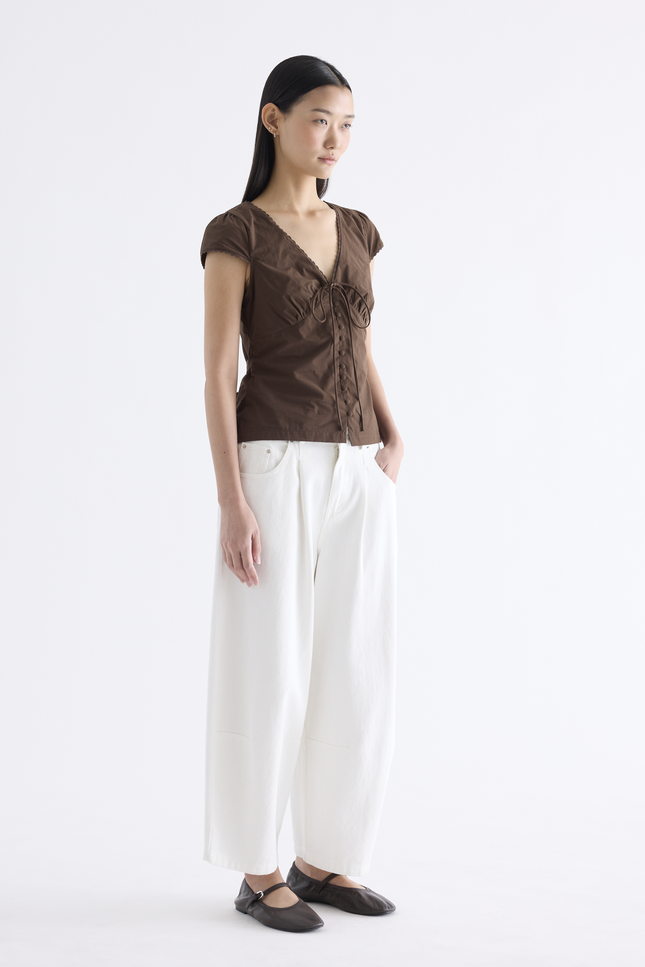 Details that count. Made from crisp and softly structured cotton, this lace-trimmed blouse features a V-shaped bustier neckline with a tie-strap, cap sleeves, front loop buttons and a back tie-strap. Worn in a slim fit with a side zip closure.