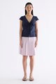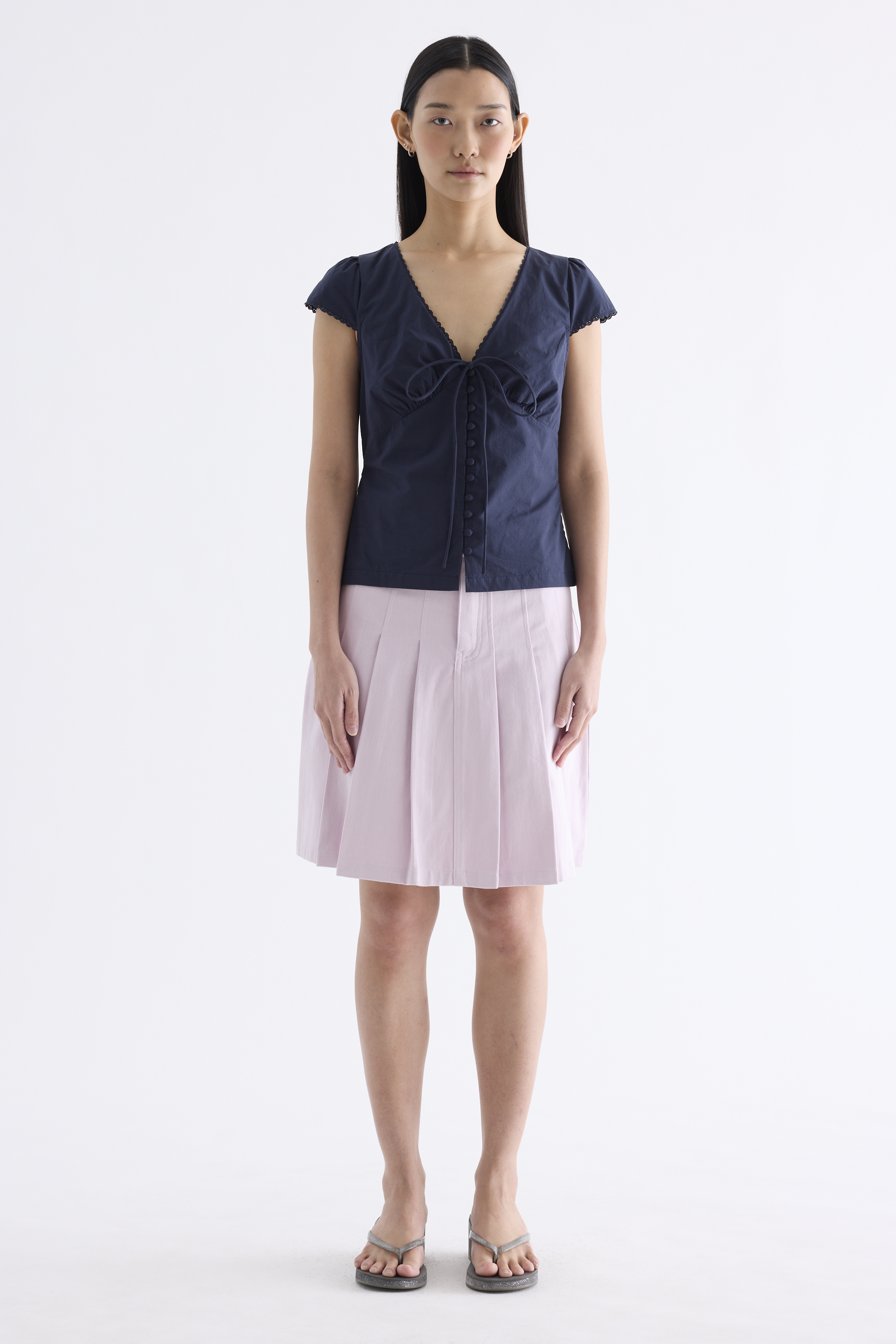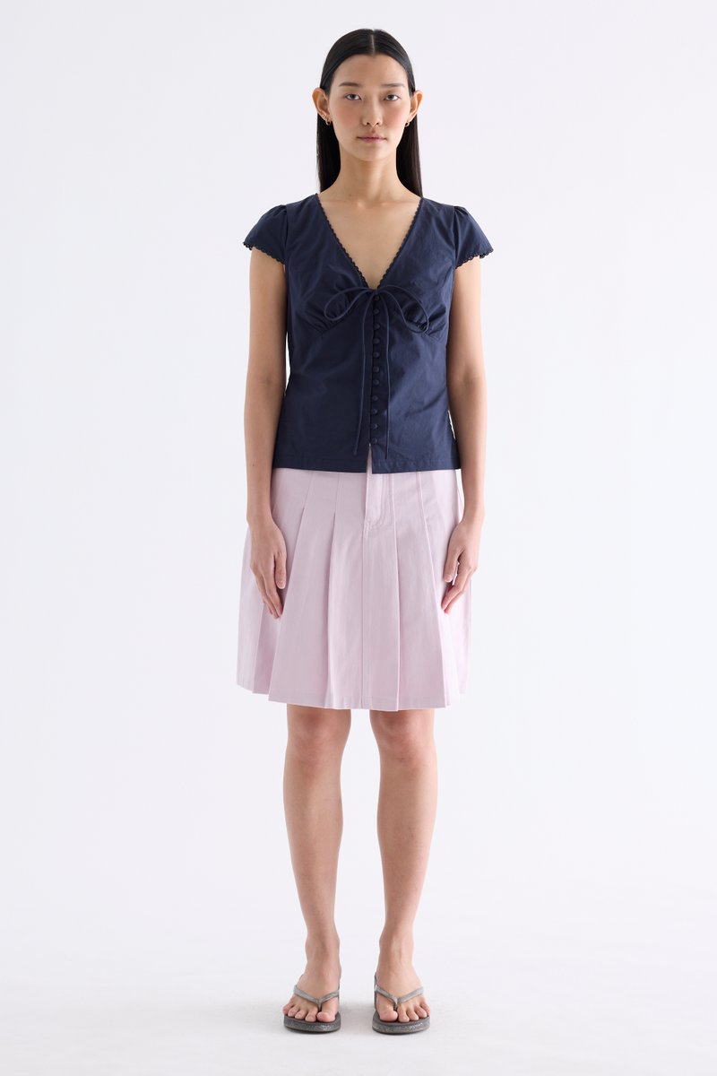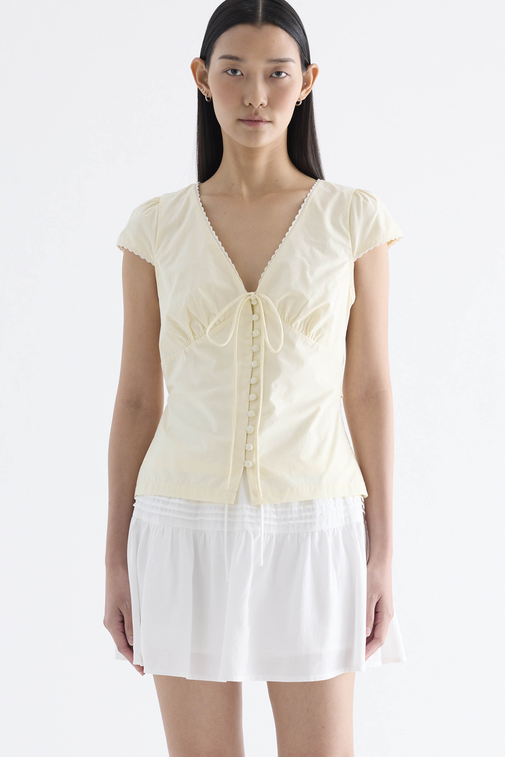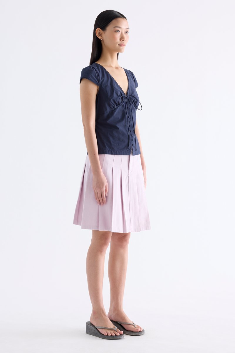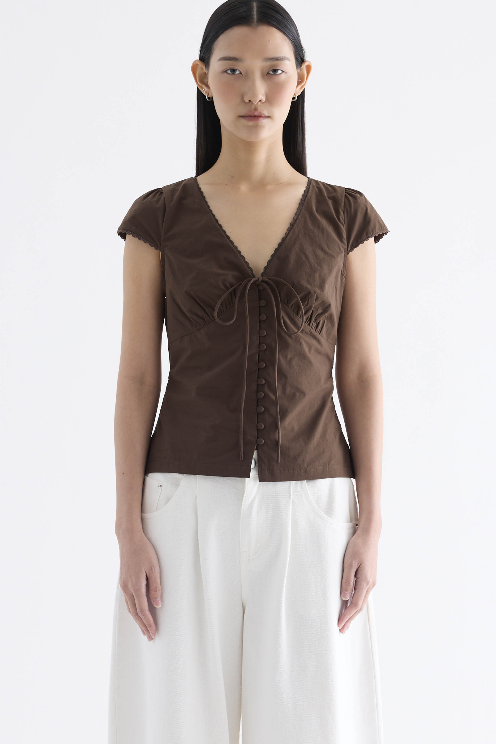 Details that count. Made from crisp and softly structured cotton, this lace-trimmed blouse features a V-shaped bustier neckline with a tie-strap, cap sleeves, front loop buttons and a back tie-strap. Worn in a slim fit with a side zip closure.