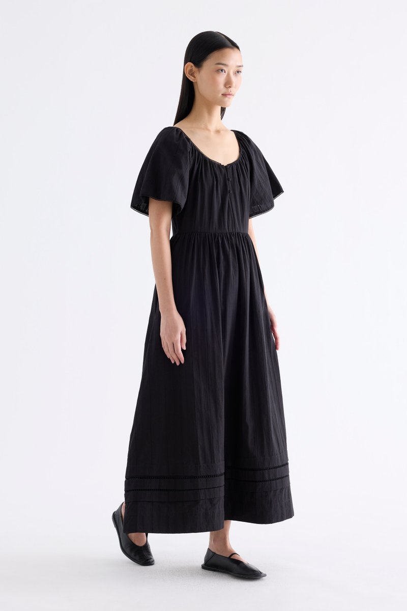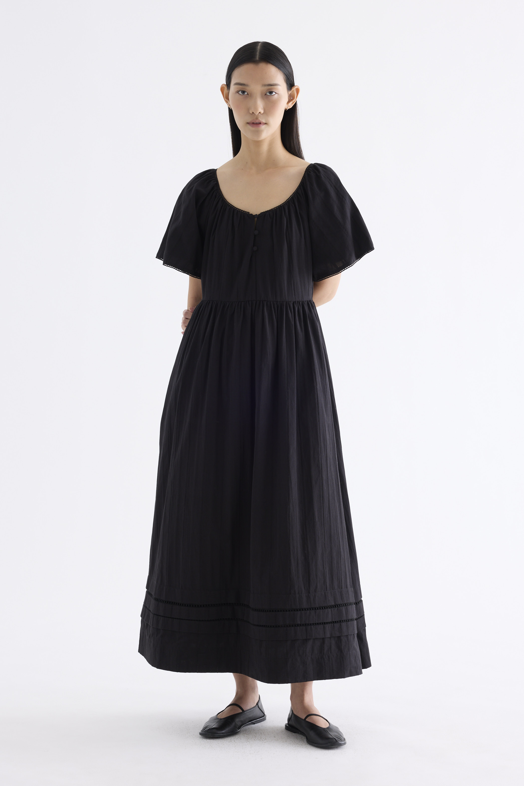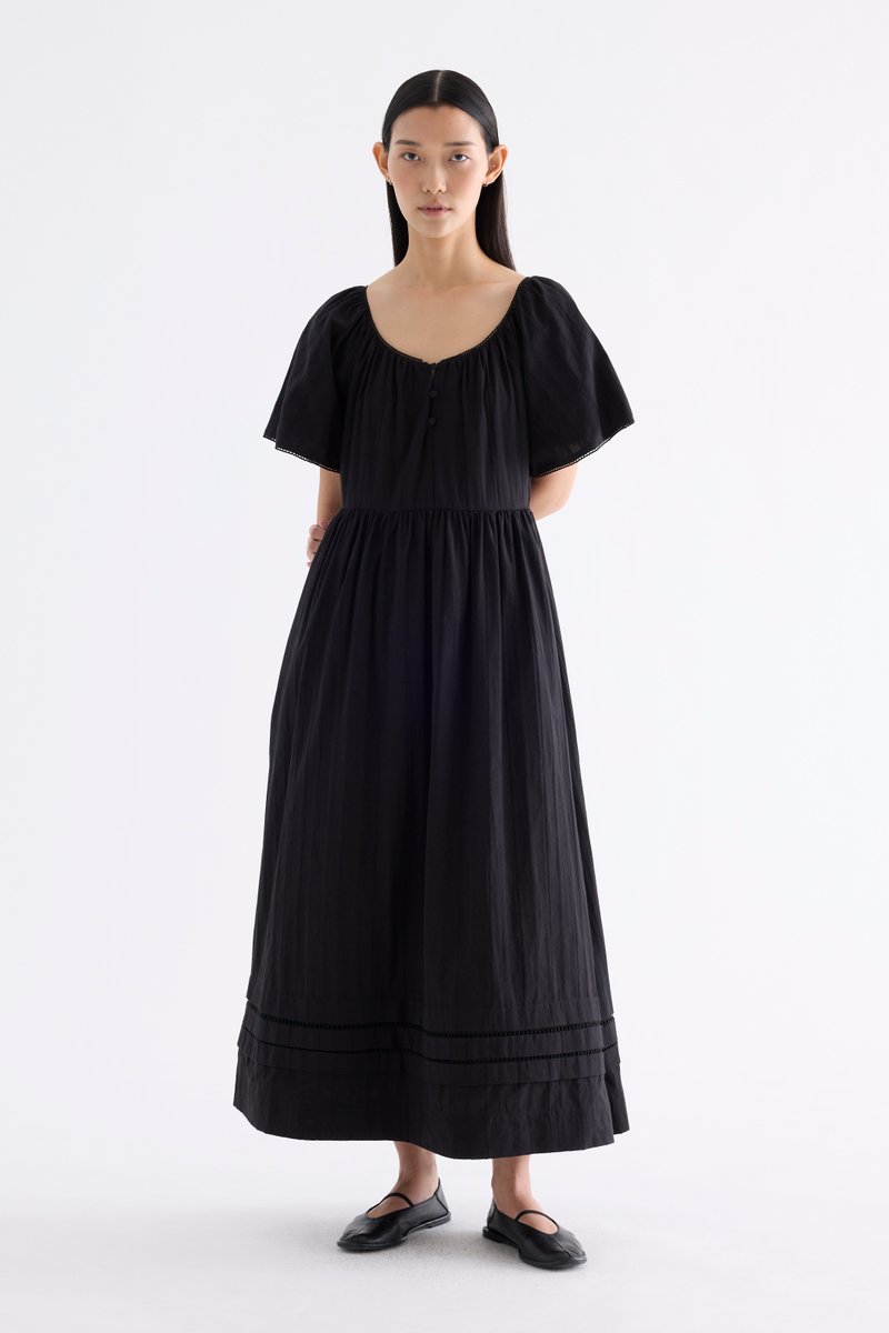 Big statement. Made from airy and softly structured cotton, this maxi dress features a lace-trimmed round neckline, lace-trimmed short bell sleeves, front buttons and a side zip closure. Worn in an A-line silhouette that fits slimmer at the waist before flaring out in a relaxed skirt.