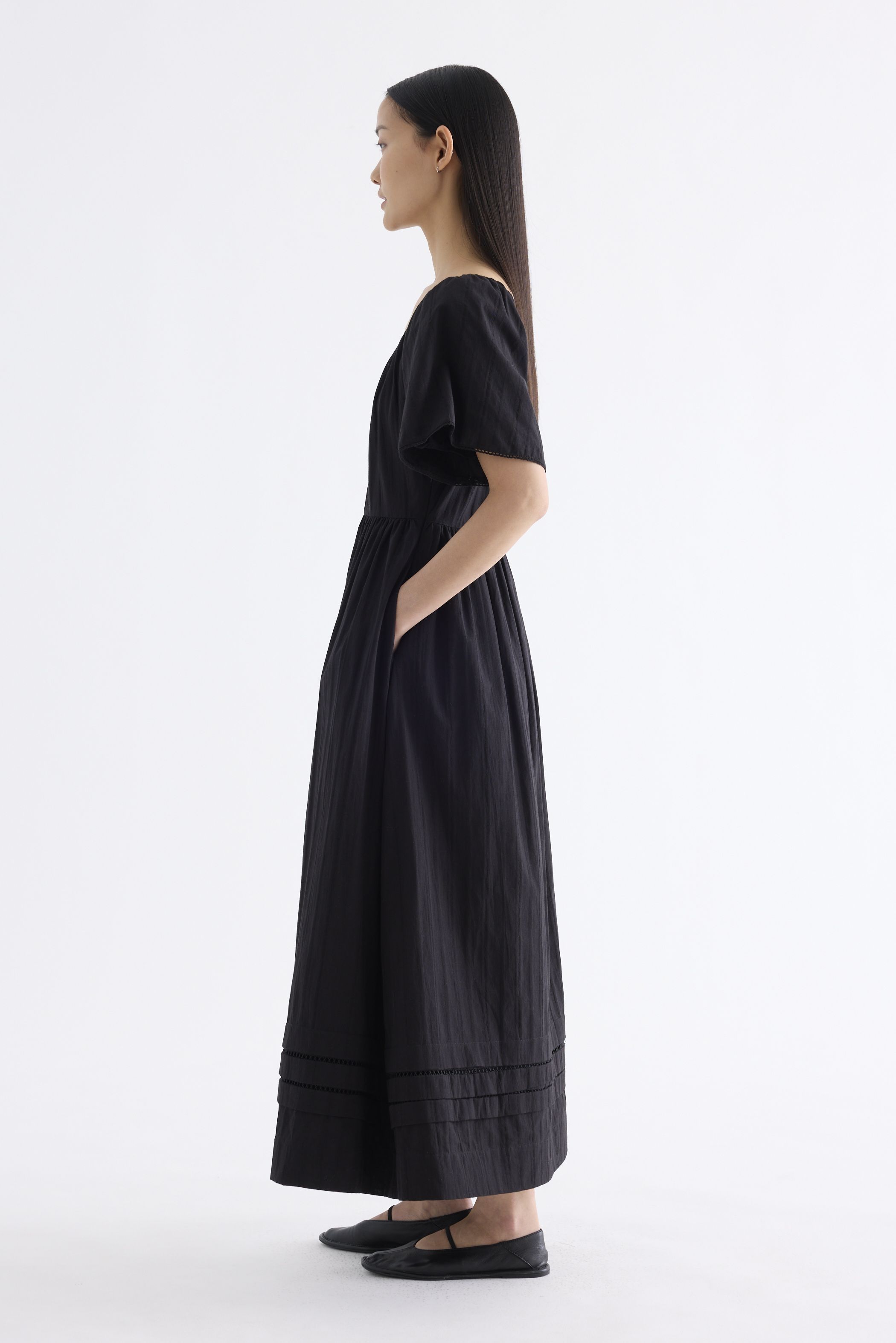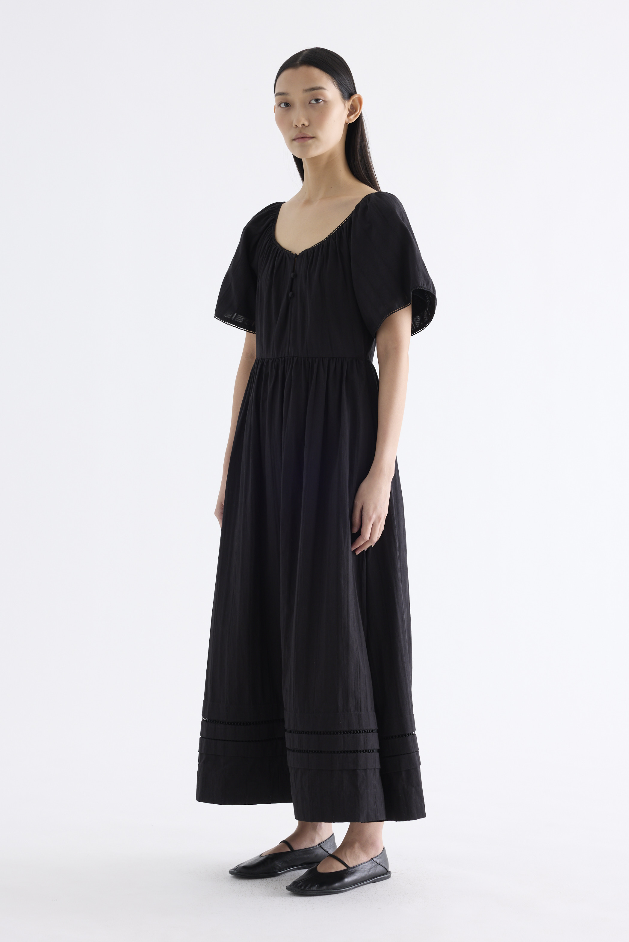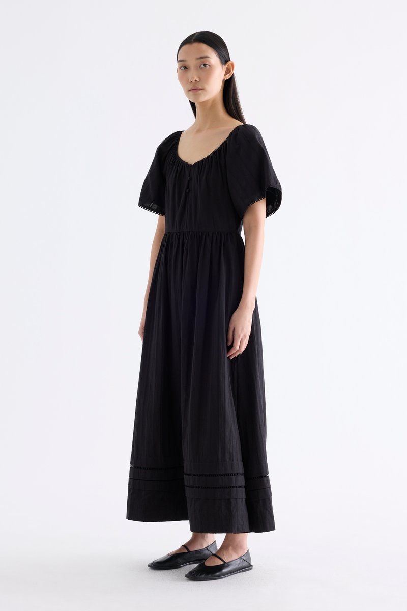 Big statement. Made from airy and softly structured cotton, this maxi dress features a lace-trimmed round neckline, lace-trimmed short bell sleeves, front buttons and a side zip closure. Worn in an A-line silhouette that fits slimmer at the waist before flaring out in a relaxed skirt.