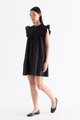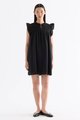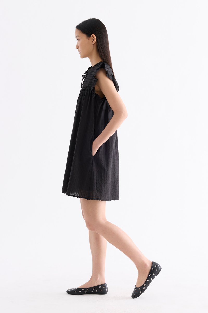 Spring ahead. Cut from airy and softly structured seersucker cotton, this dress features flutter cap sleeves, a round frill-trimmed neckline, front keyhole opening with a tie-strap, as well as pleat and lace details. Fits slim and above the knee.