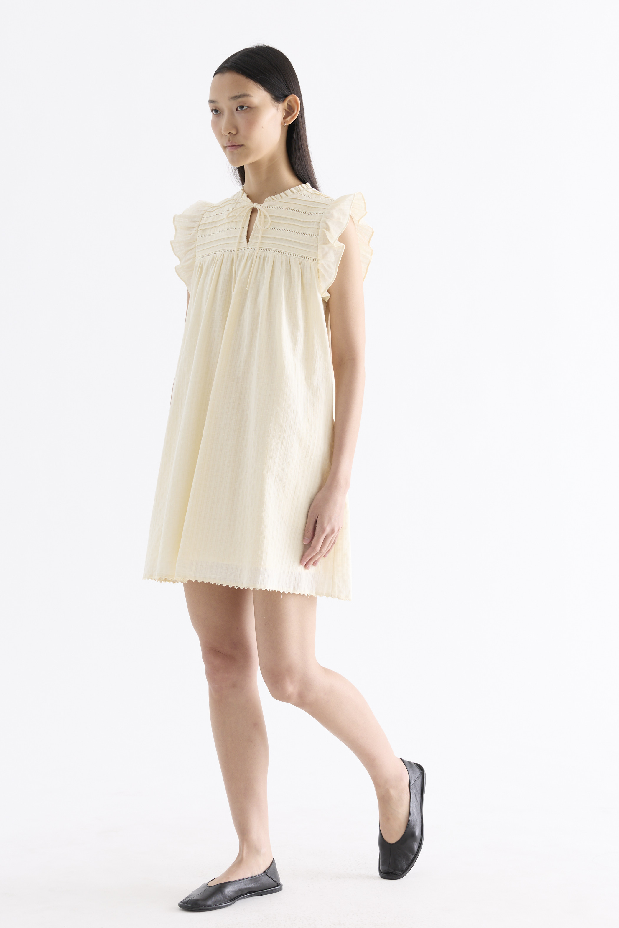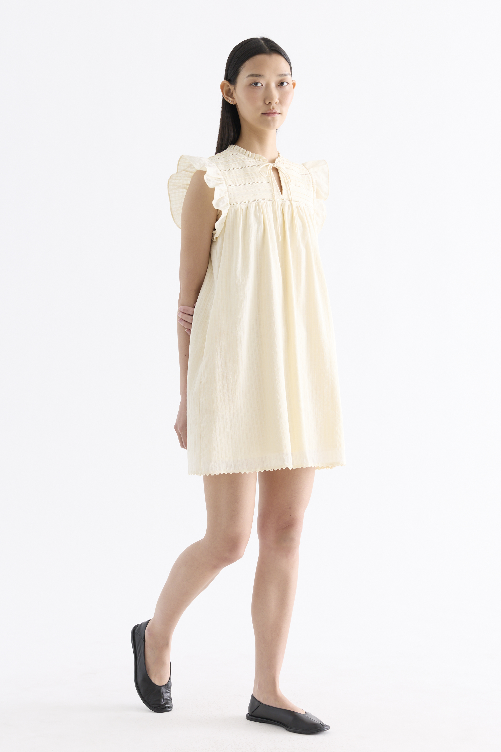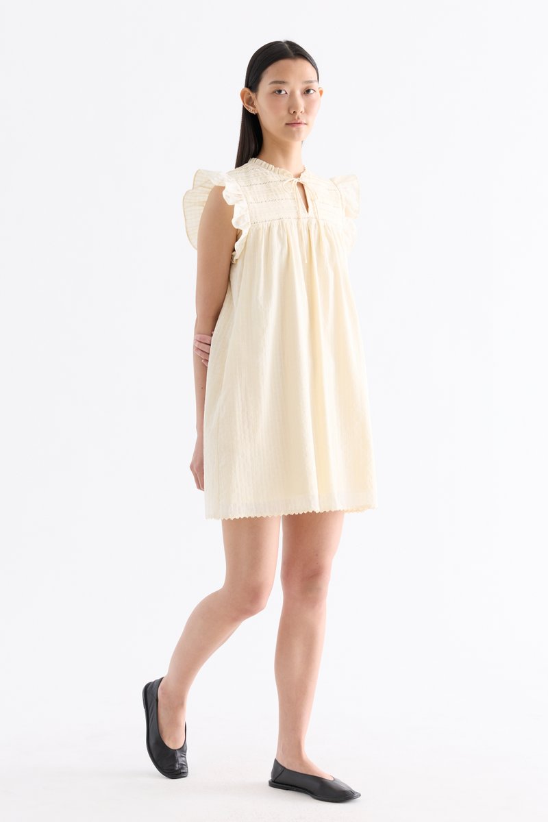 Spring ahead. Cut from airy and softly structured seersucker cotton, this dress features flutter cap sleeves, a round frill-trimmed neckline, front keyhole opening with a tie-strap, as well as pleat and lace details. Fits slim and above the knee.