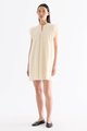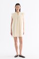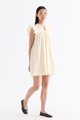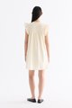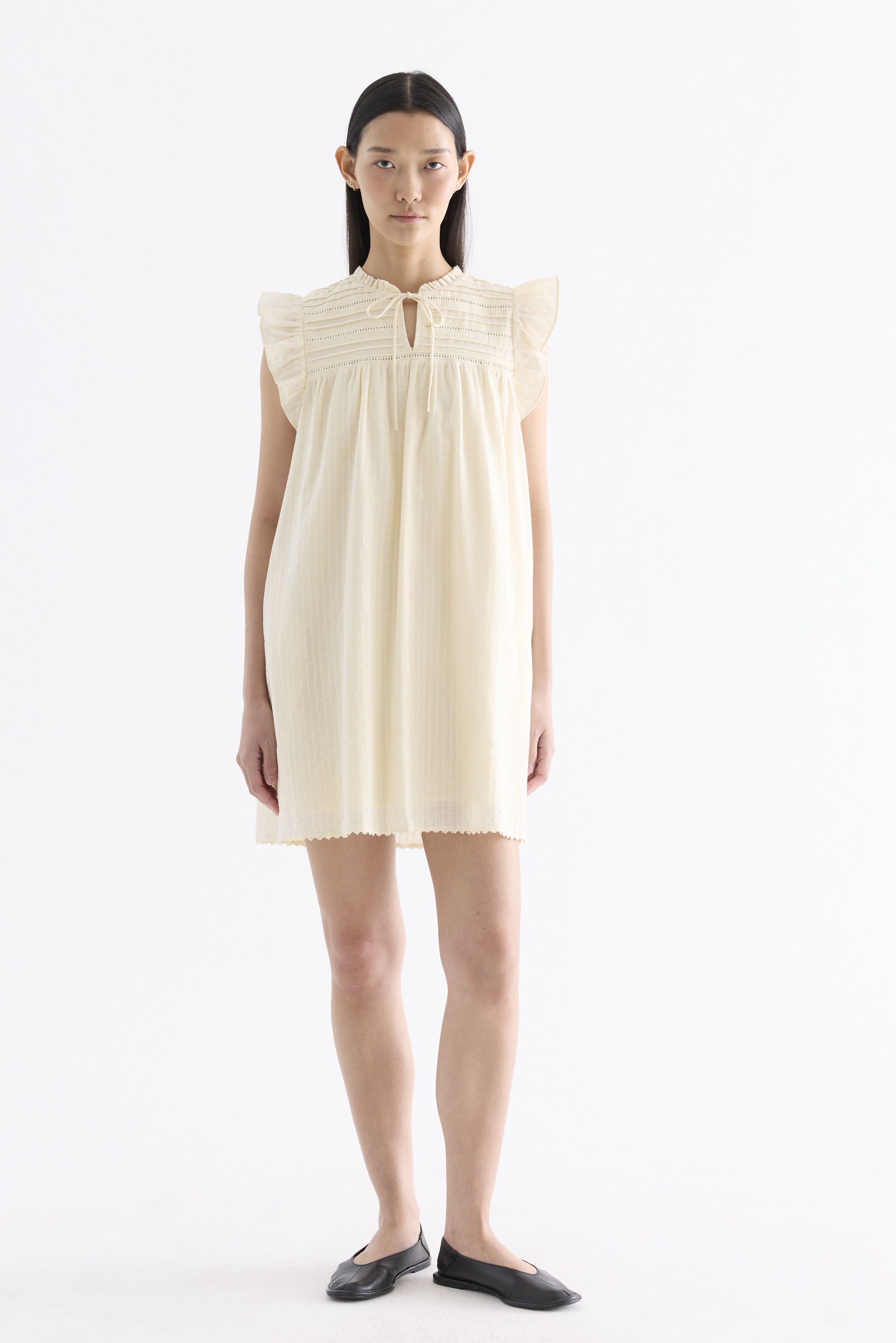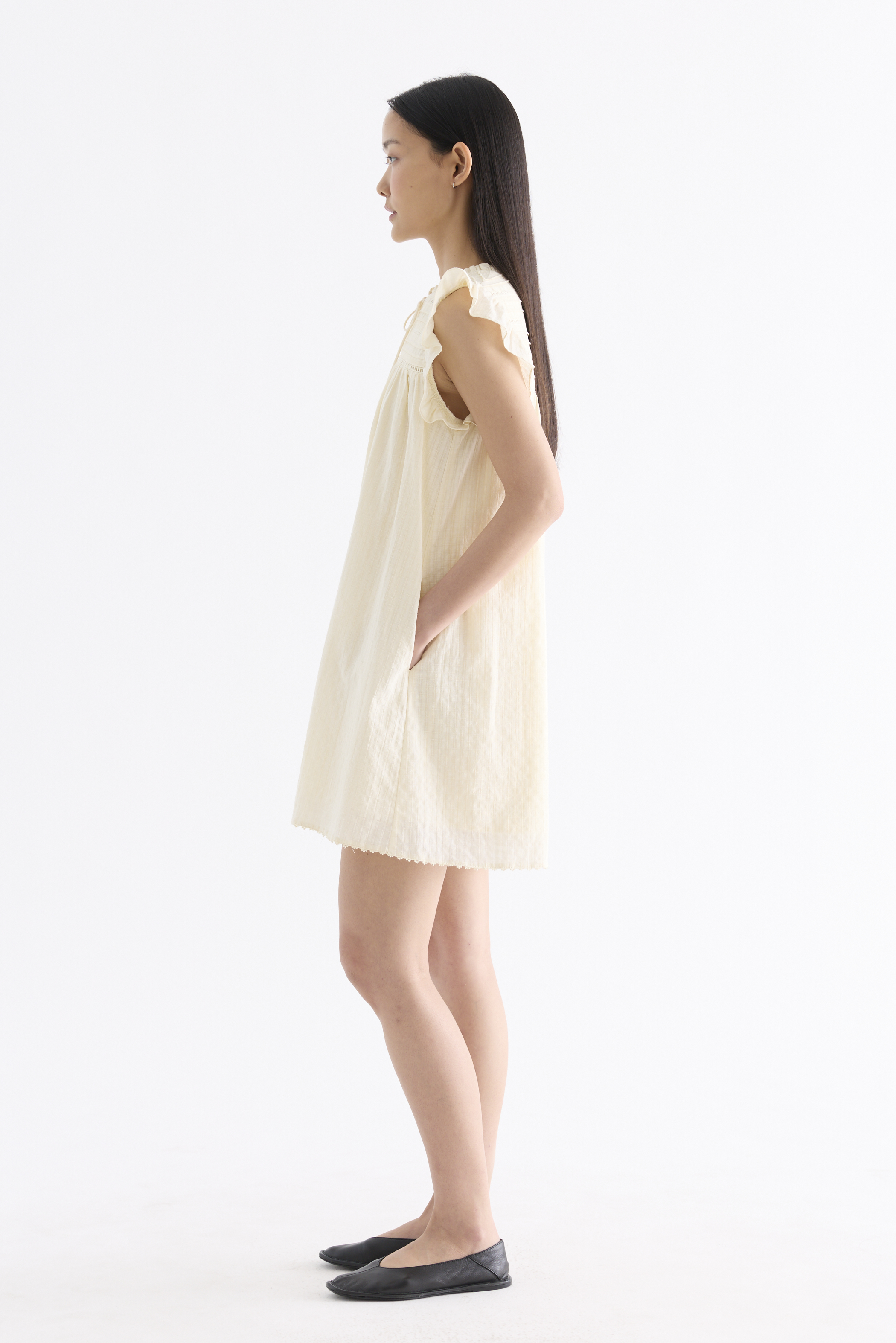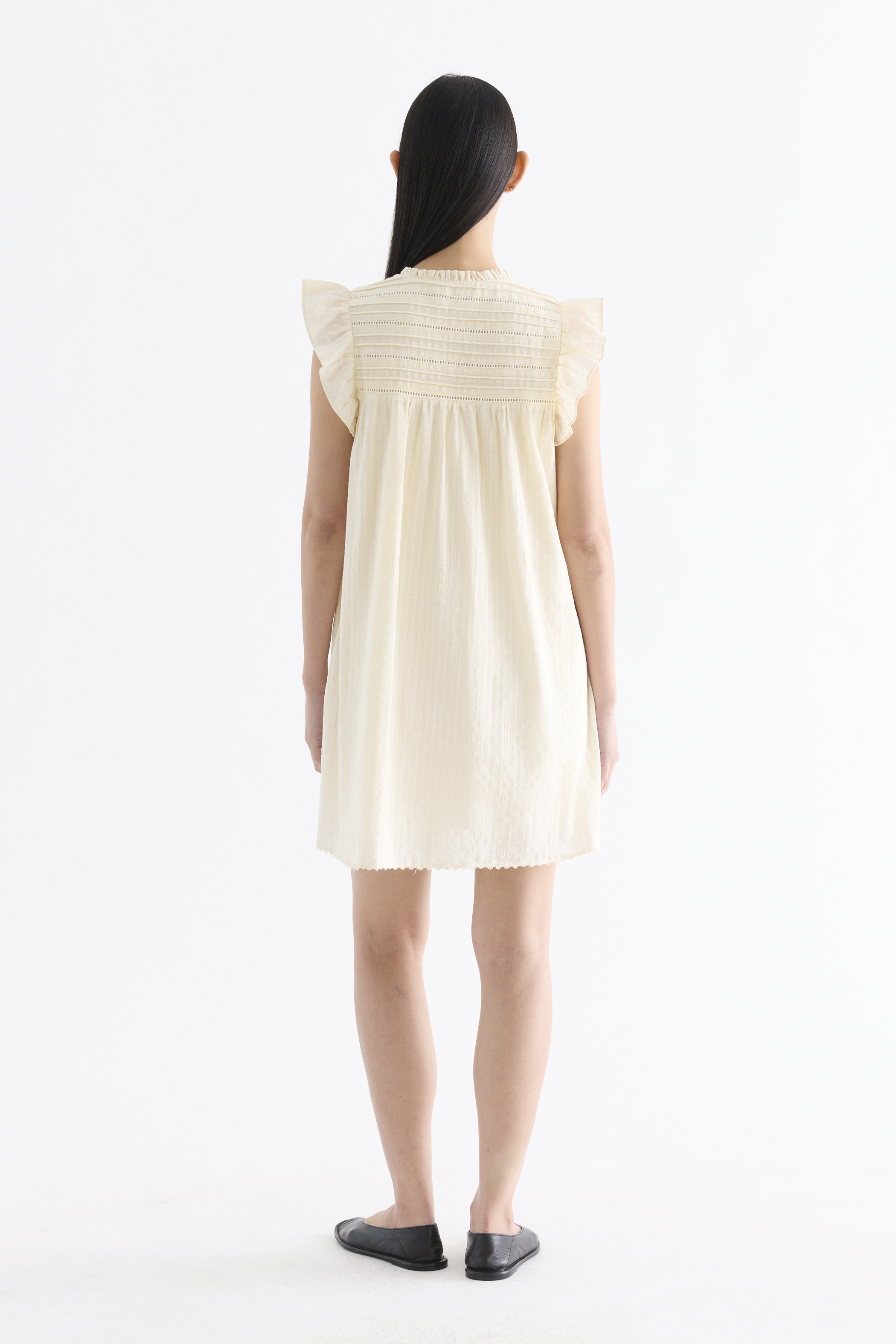 Spring ahead. Cut from airy and softly structured seersucker cotton, this dress features flutter cap sleeves, a round frill-trimmed neckline, front keyhole opening with a tie-strap, as well as pleat and lace details. Fits slim and above the knee.