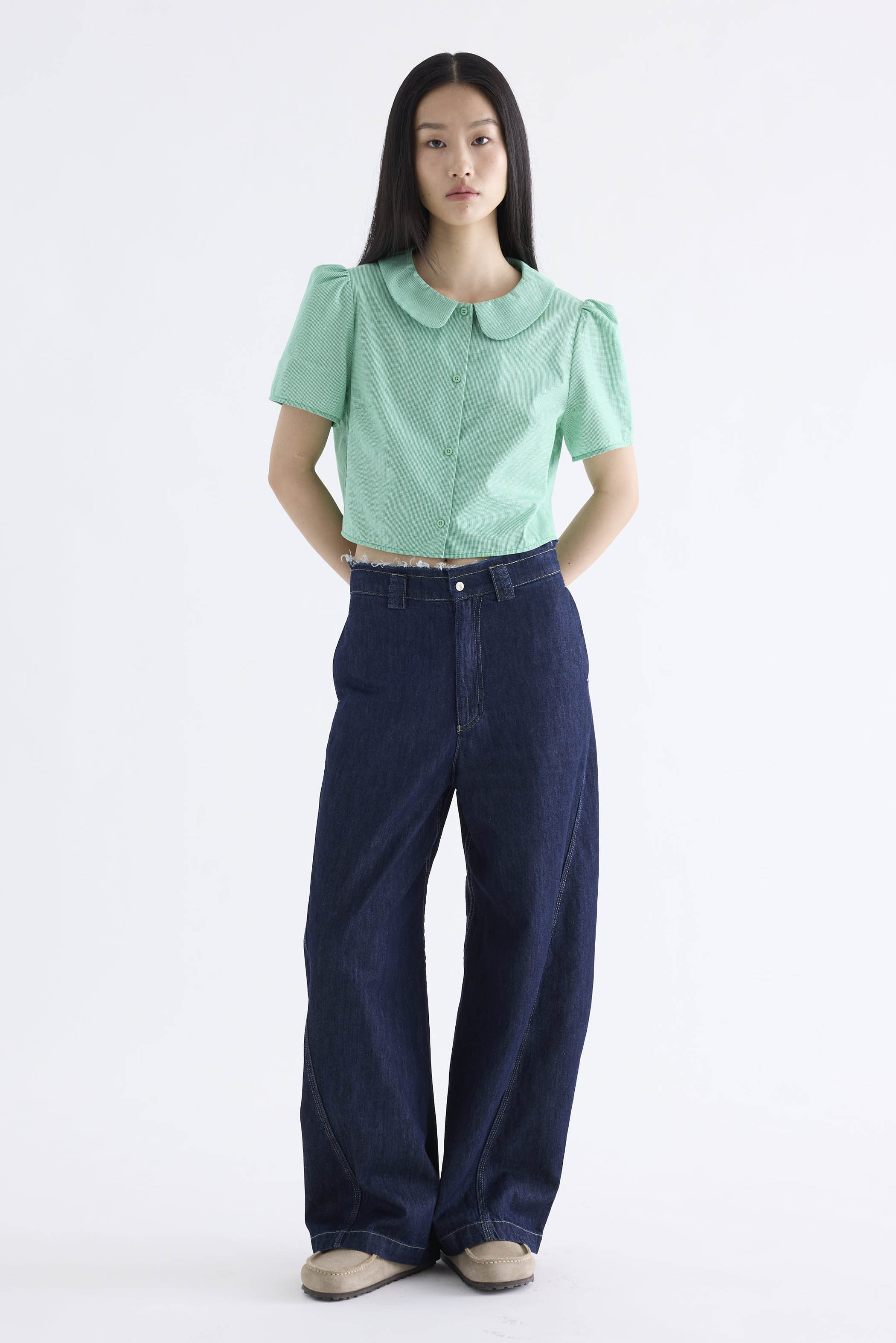 From the Postscript collection. This blouse features a boxy silhouette, rounded collars, puffy short sleeves and a button-down front. Fits relaxed.