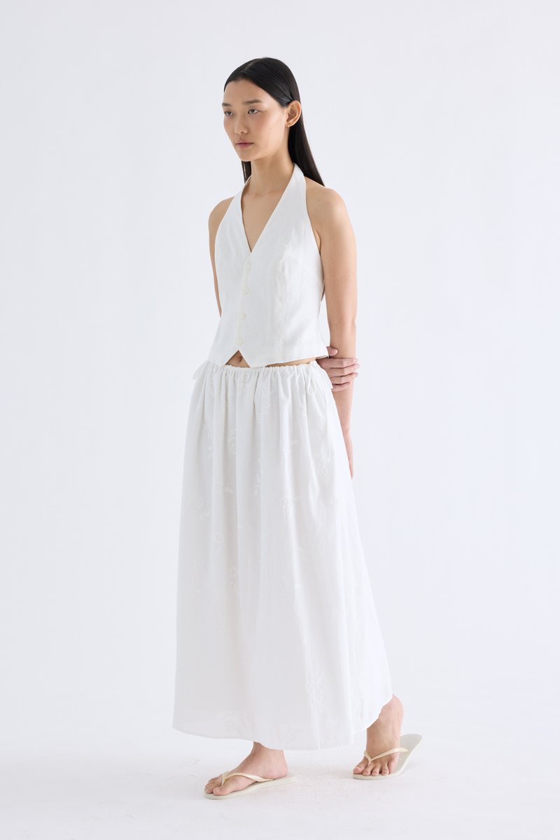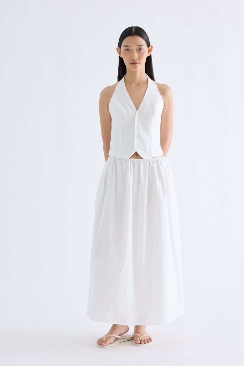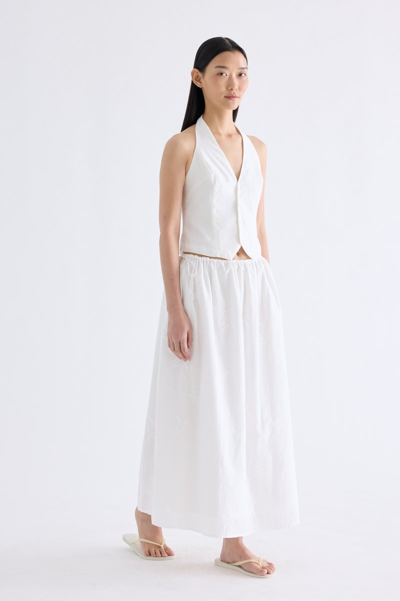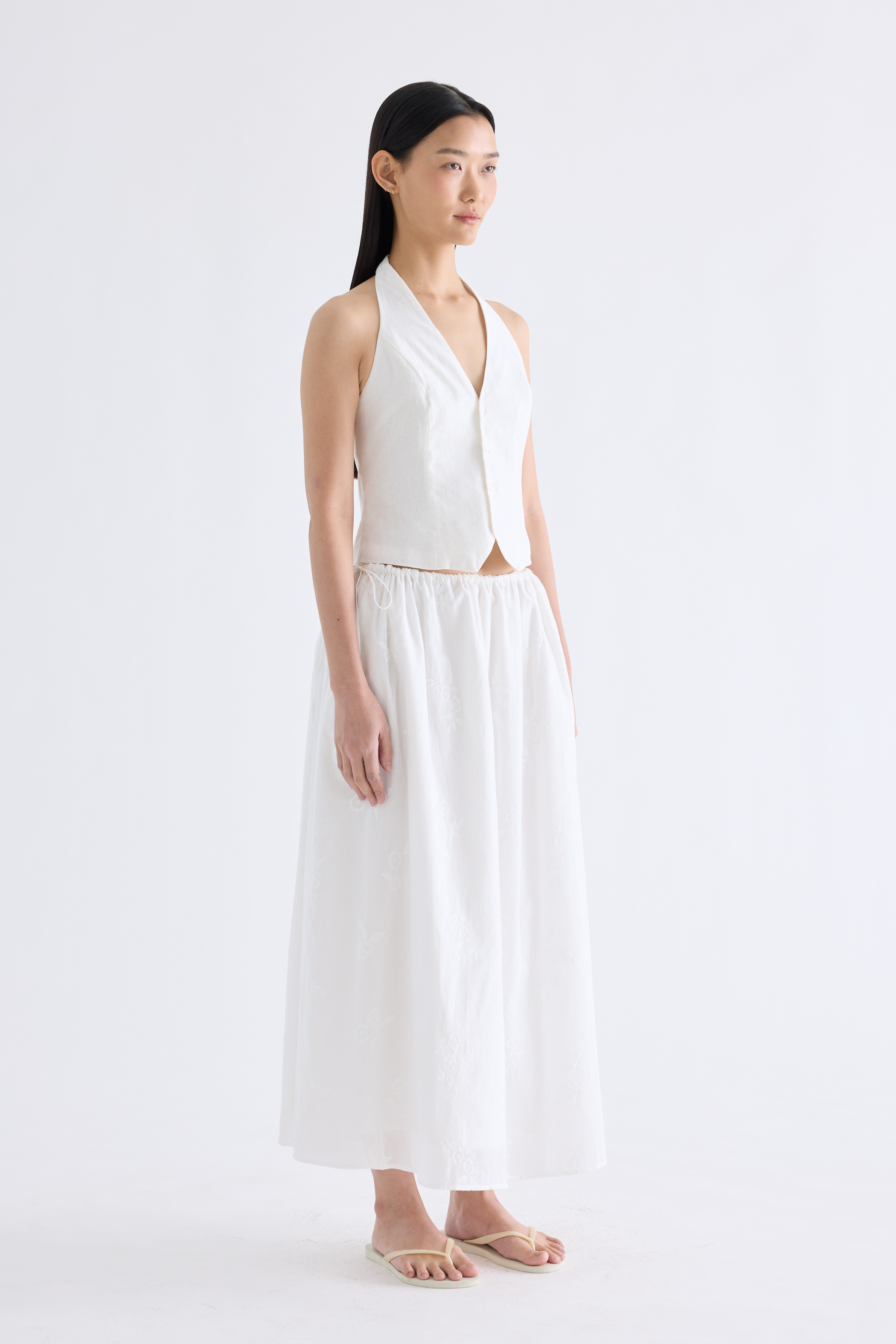Top of the line. Cut from airy and gently tailored linen, this sleeveless vest top features an open back, an elasticated, V-shaped halter neckline and front buttons. Worn in a relaxed fit.