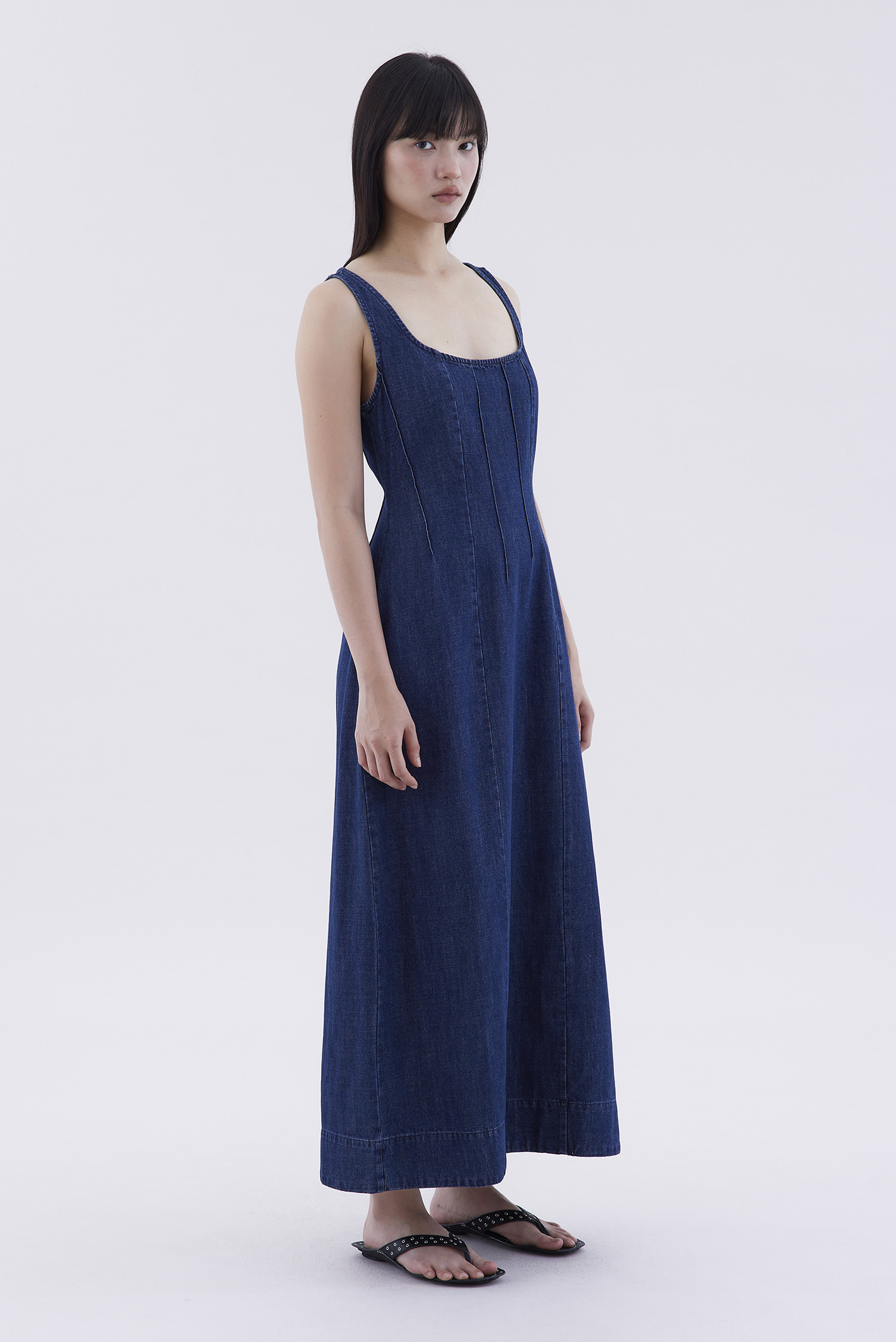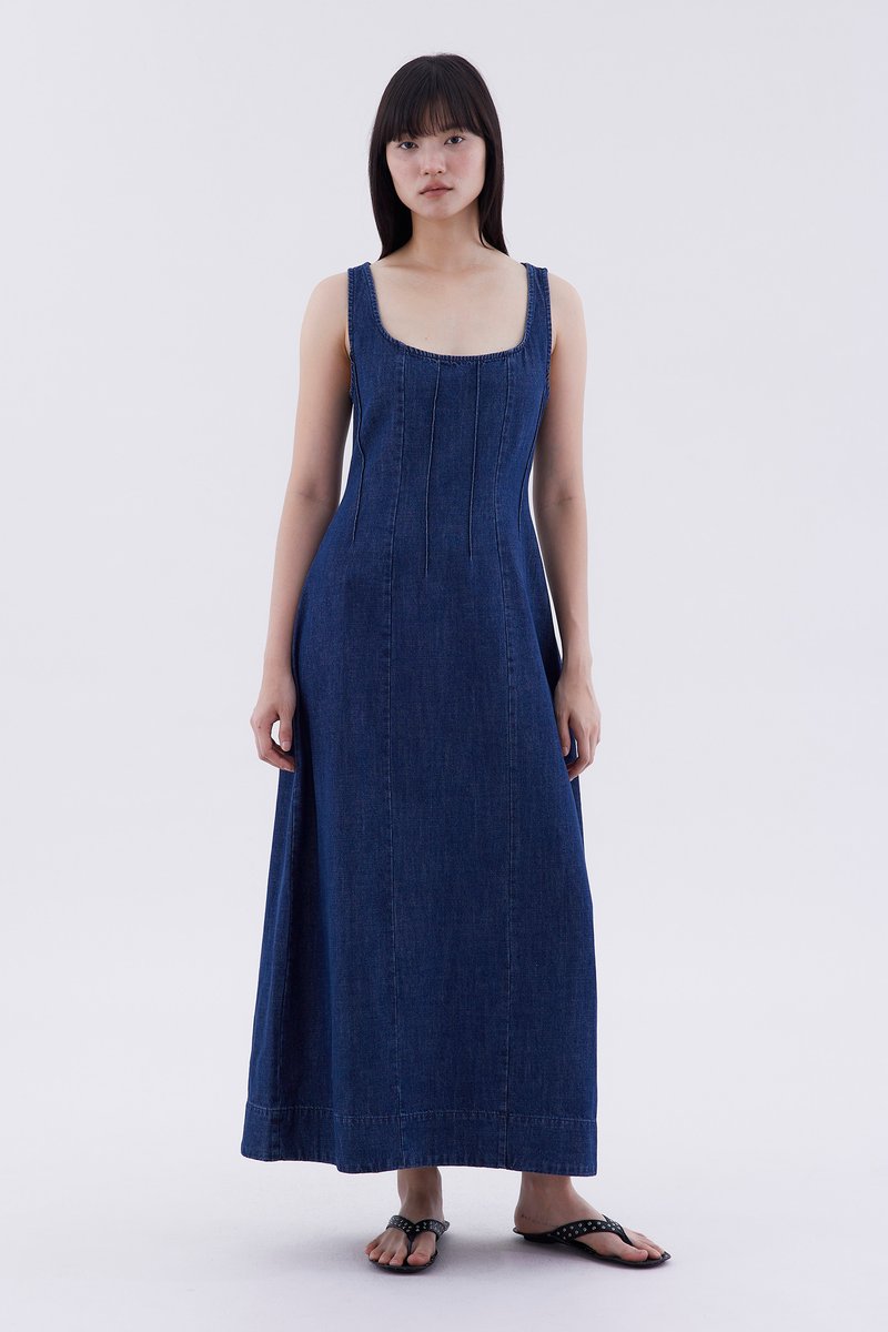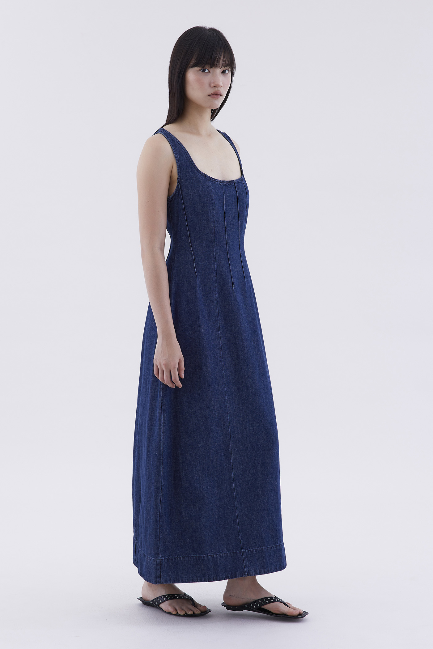 Polished. Cut from softly structured cotton denim, this sleeveless maxi dress features a scooped square neckline, wide shoulder straps, front panelling and side zip closure. Fits slimmer at the waist before flowing out in a relaxed, A-line skirt.