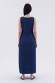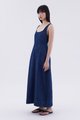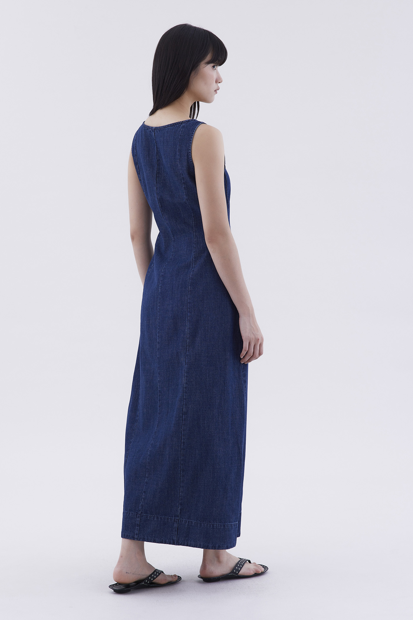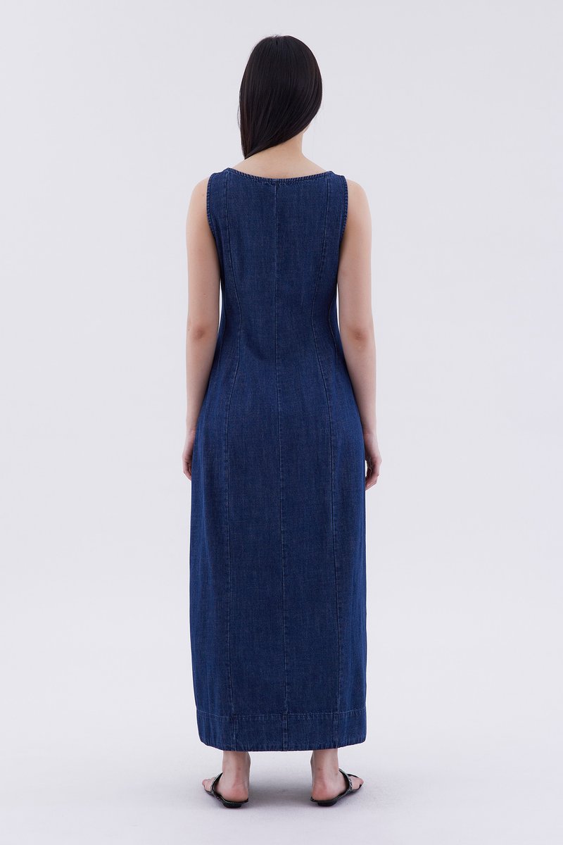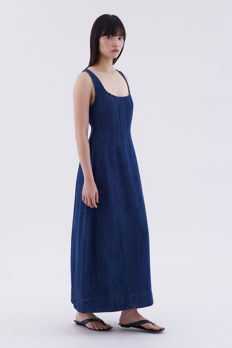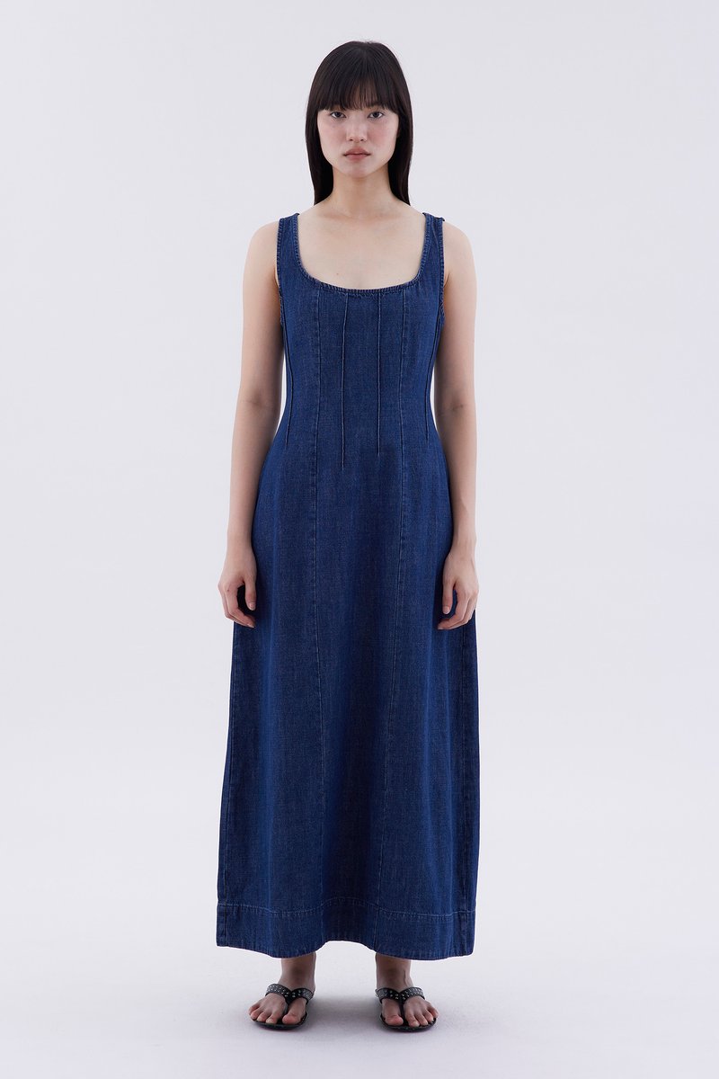 Polished. Cut from softly structured cotton denim, this sleeveless maxi dress features a scooped square neckline, wide shoulder straps, front panelling and side zip closure. Fits slimmer at the waist before flowing out in a relaxed, A-line skirt.