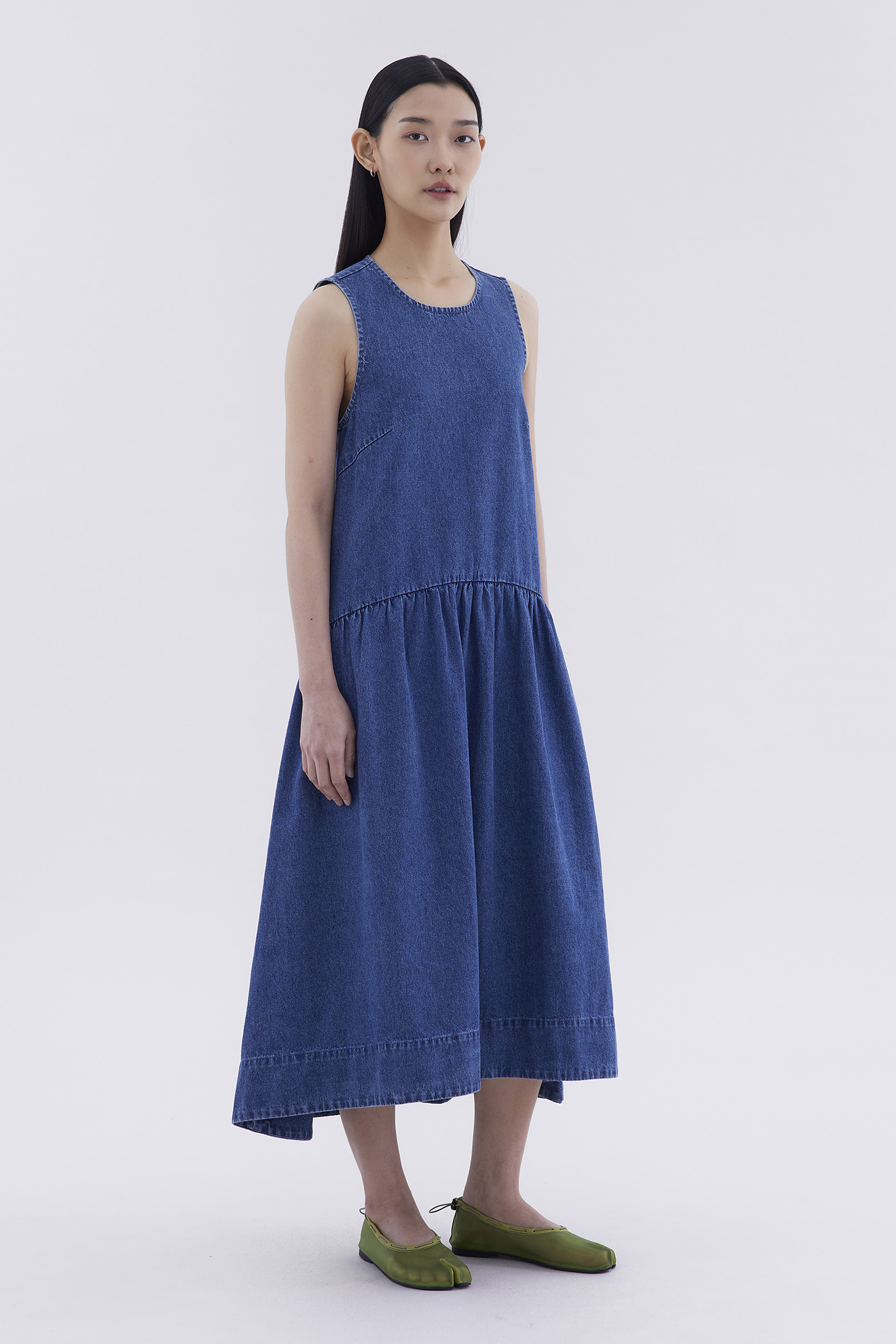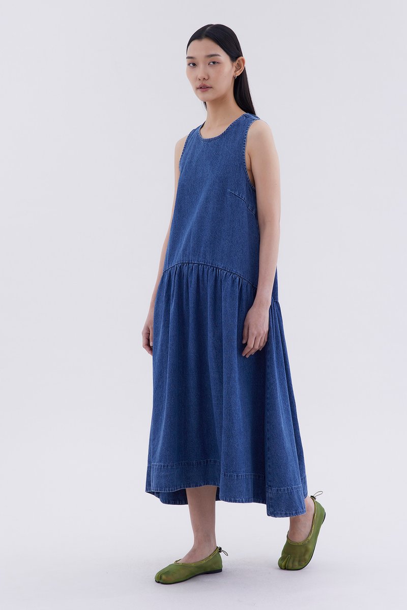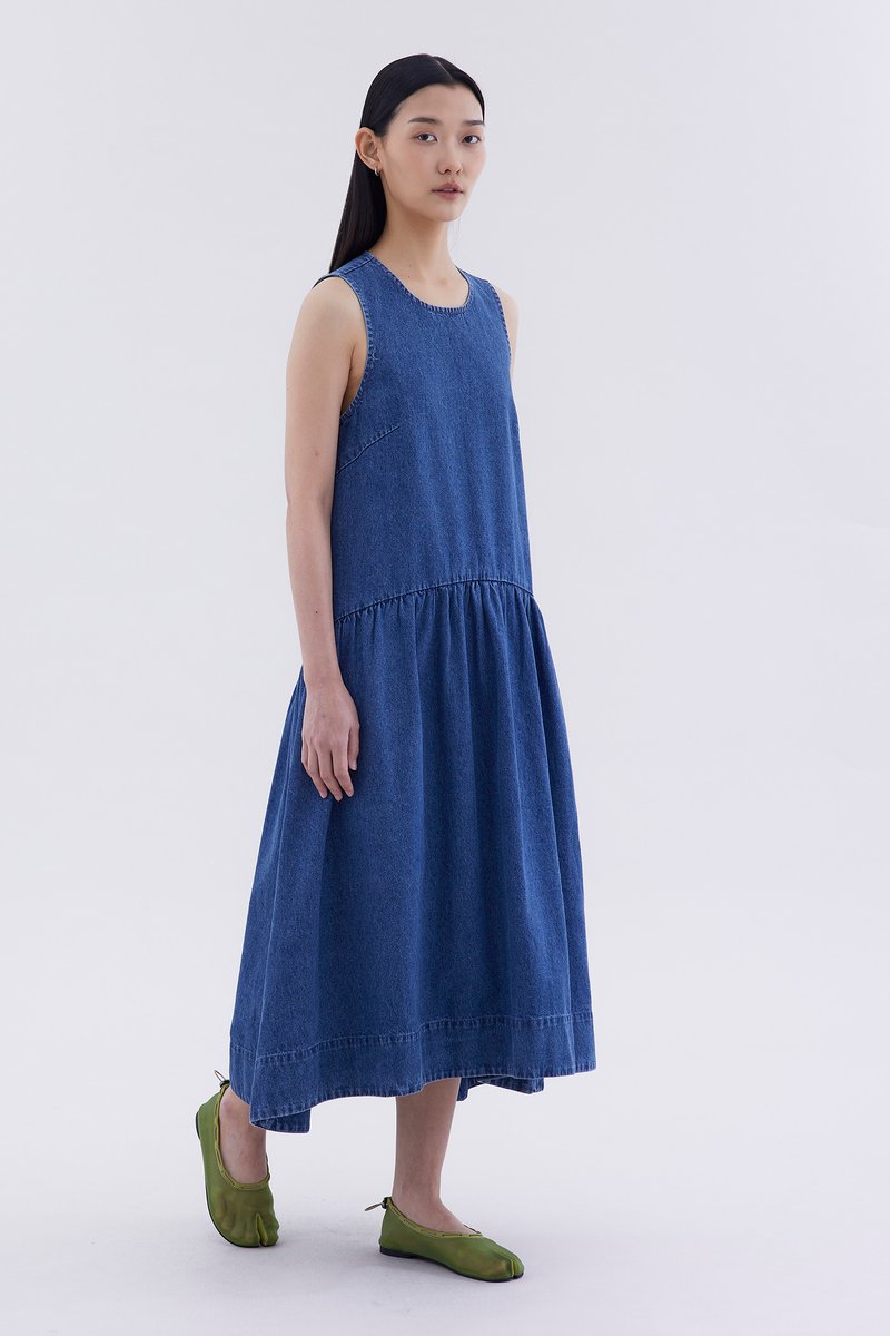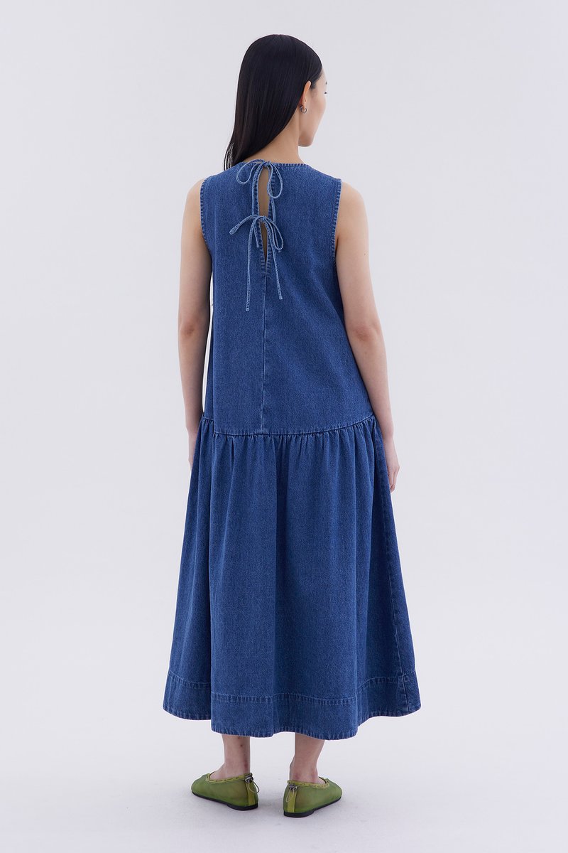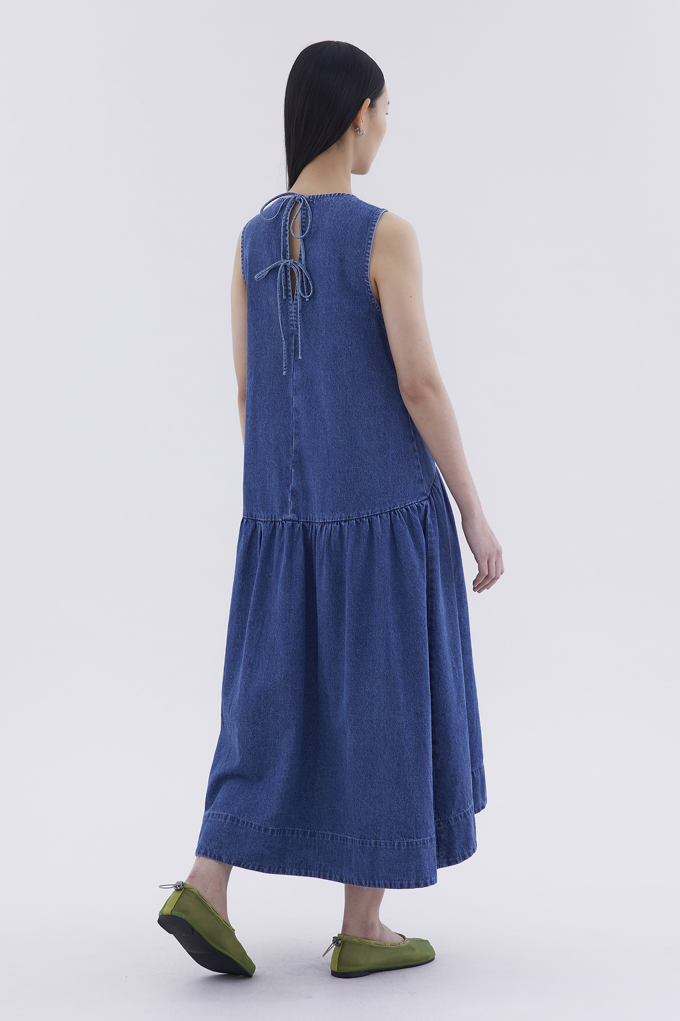 Statement proportions. Made from softly structured and non-sheer cotton denim, this sleeveless maxi dress features a round neckline, a dropped waist and a back opening with two tie-strap closures. Worn in a relaxed fit.