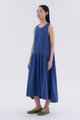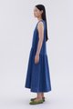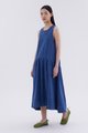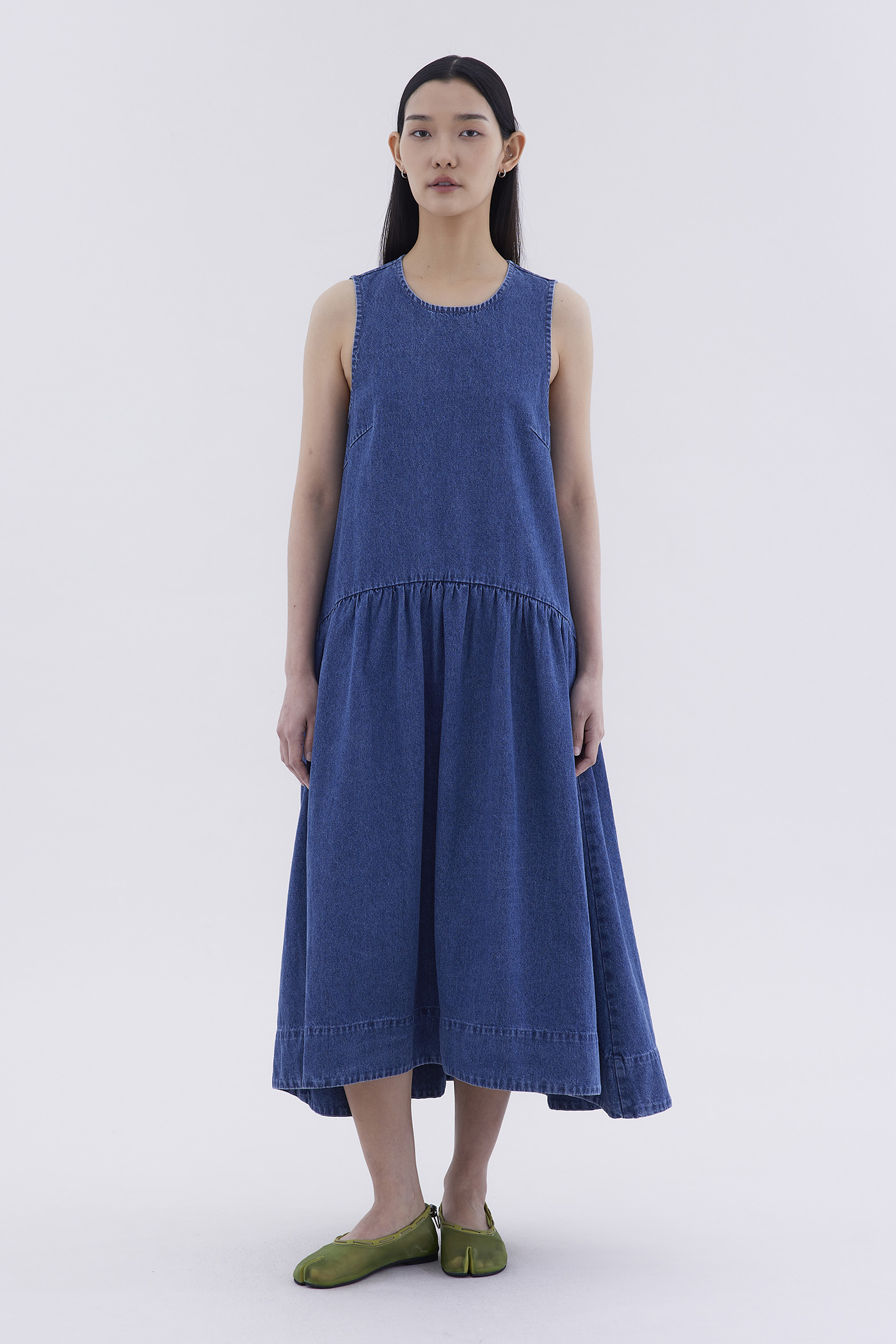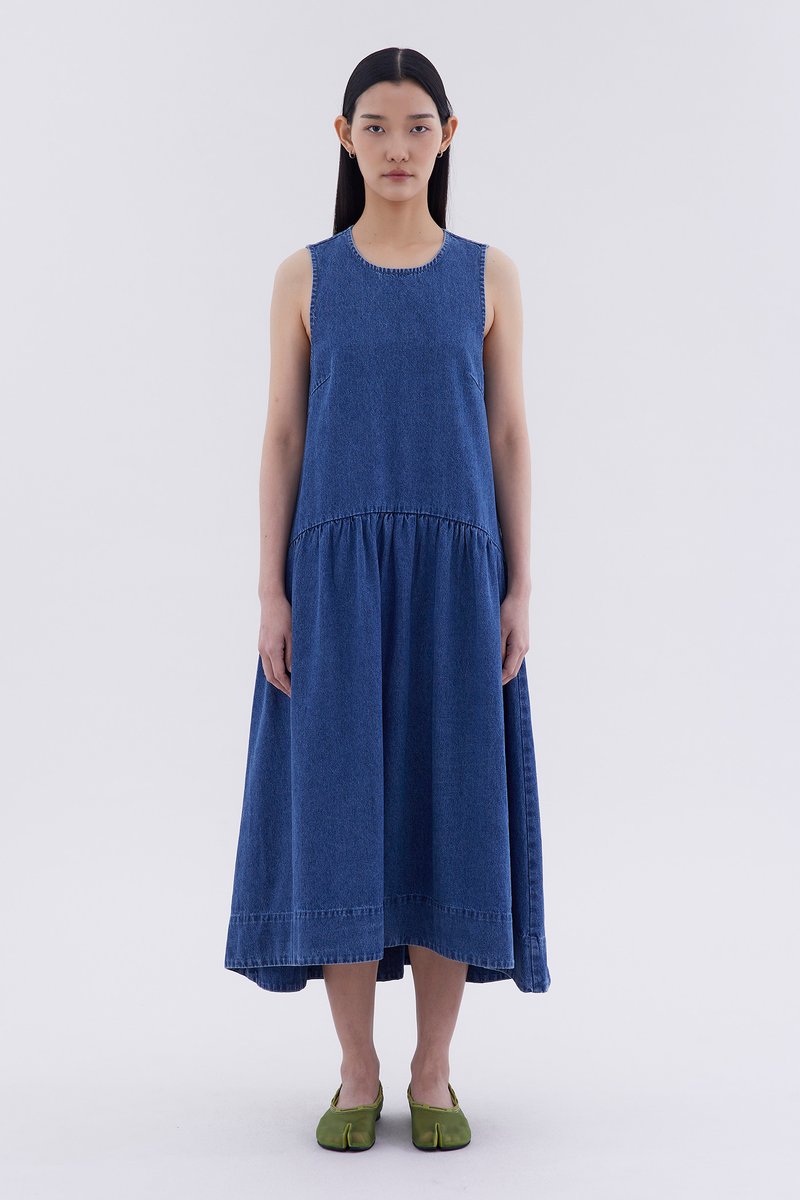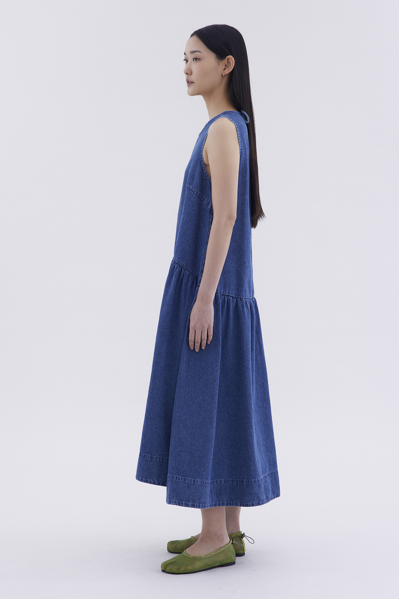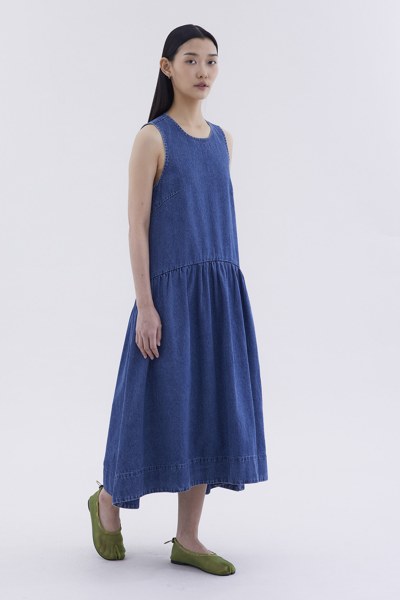 Statement proportions. Made from softly structured and non-sheer cotton denim, this sleeveless maxi dress features a round neckline, a dropped waist and a back opening with two tie-strap closures. Worn in a relaxed fit.