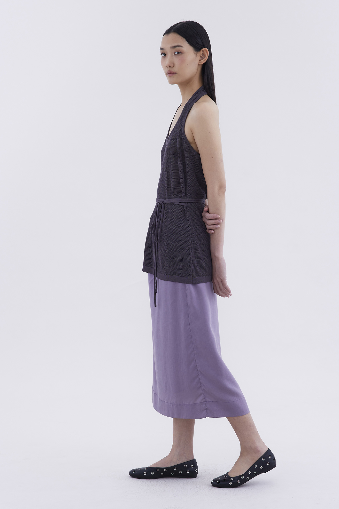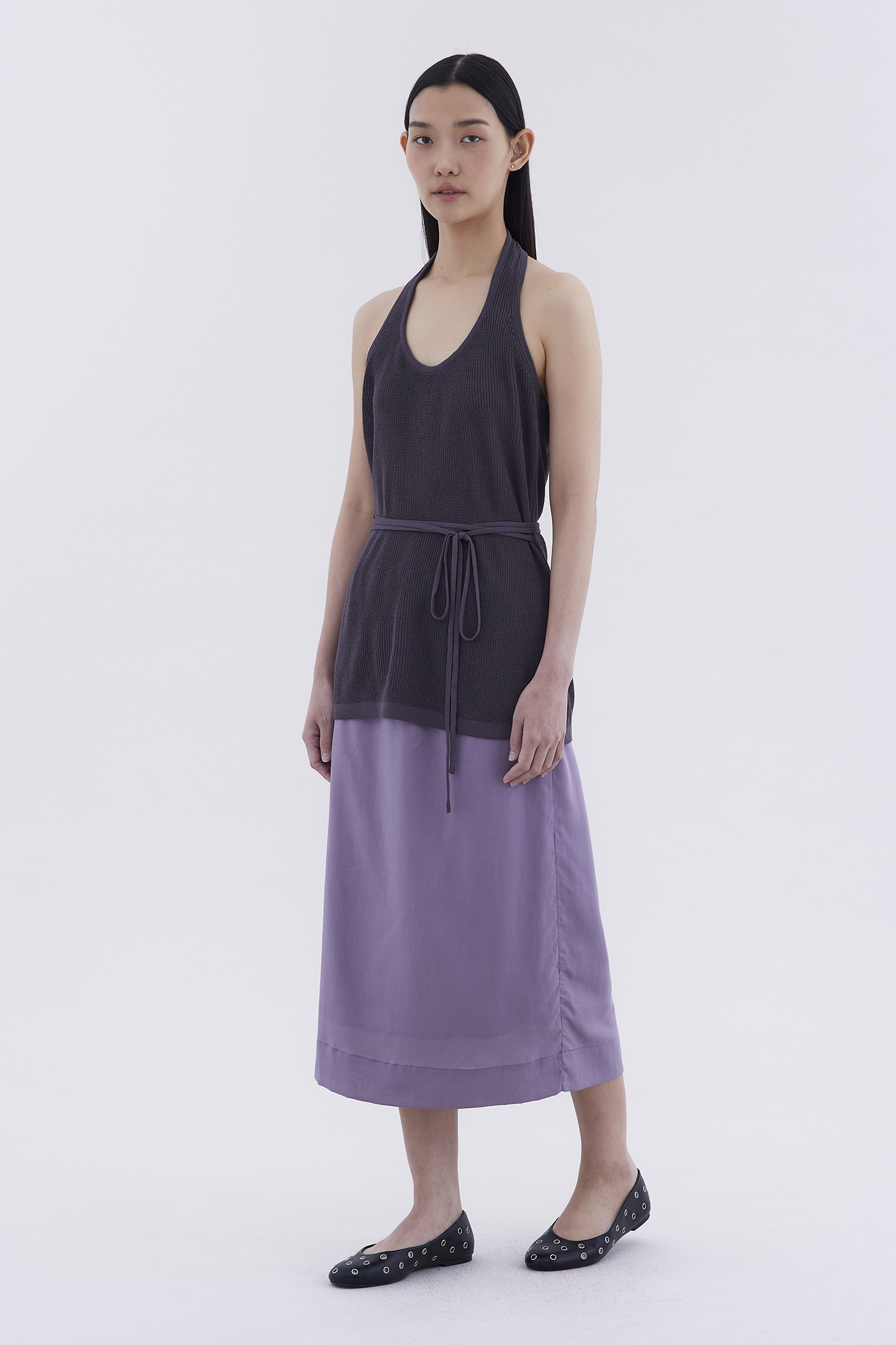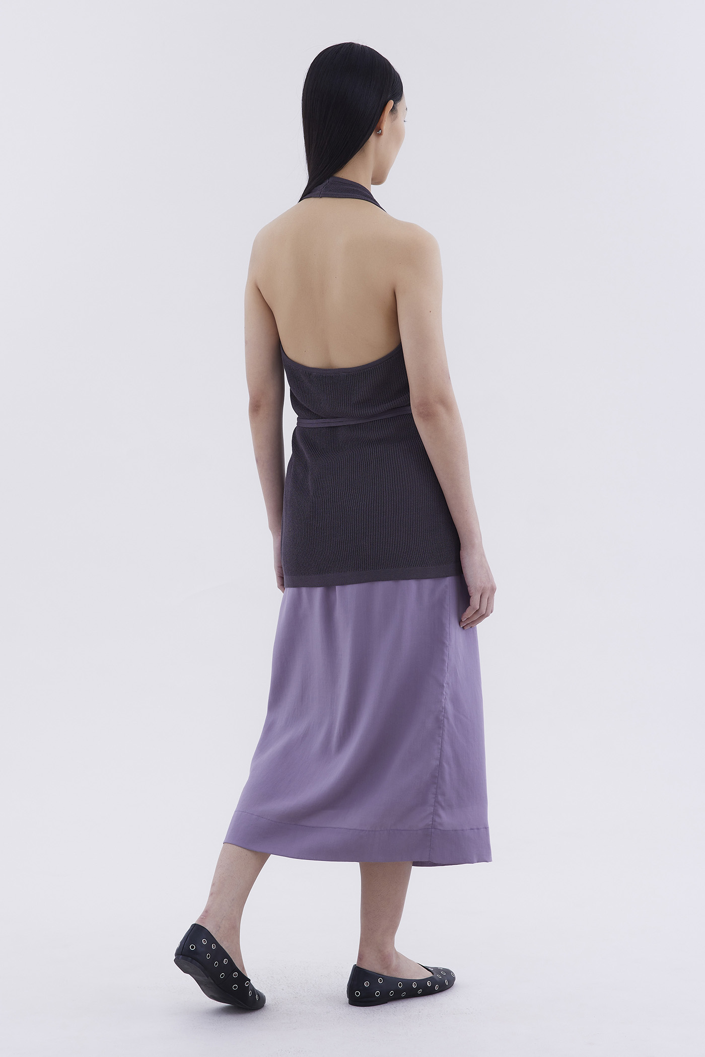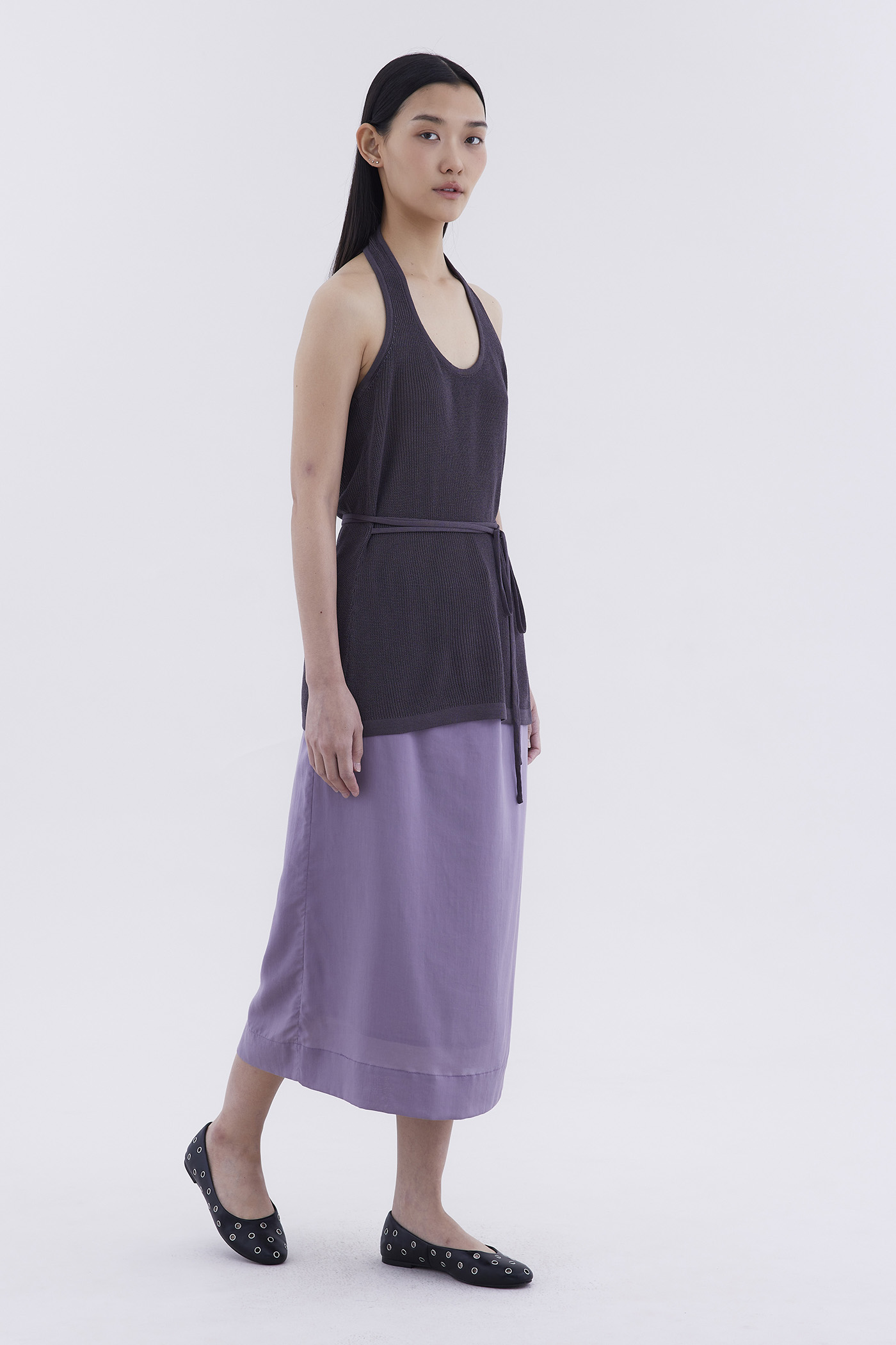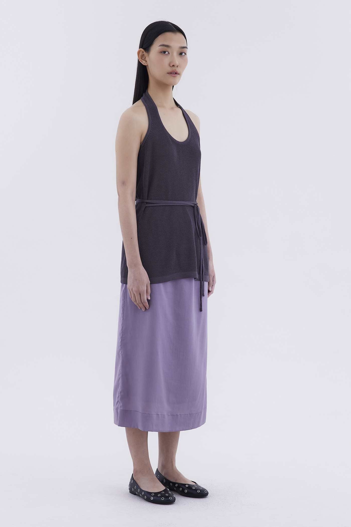Cool. Made from light and airy knit, this longline top features a halter neckline, an open back and an attached waist tie-strap. Worn in a slim fit.