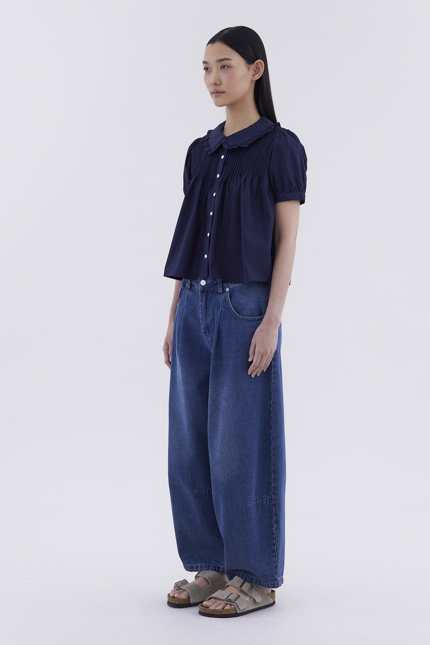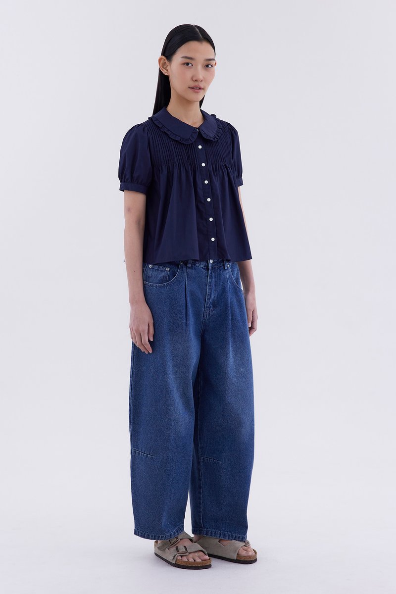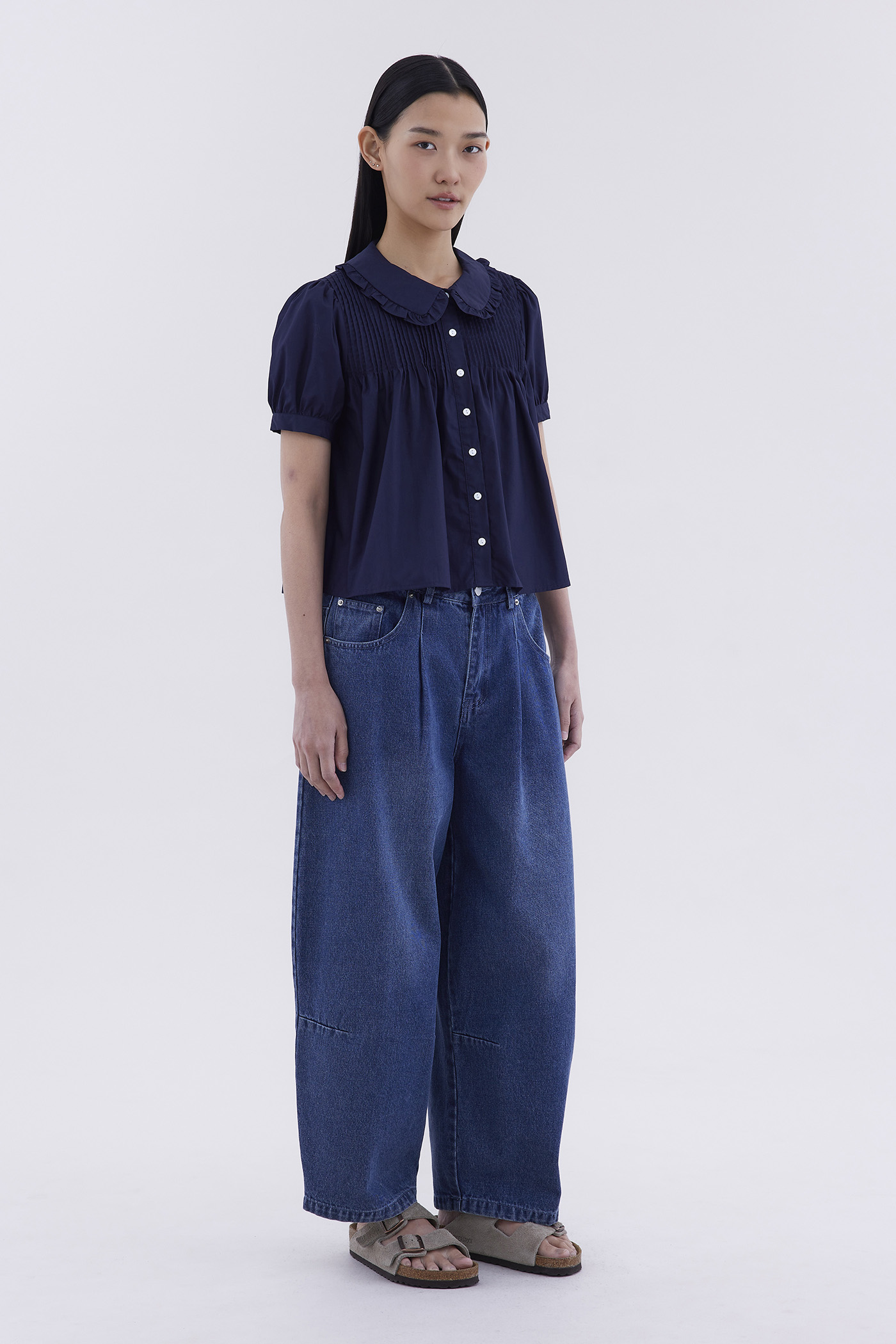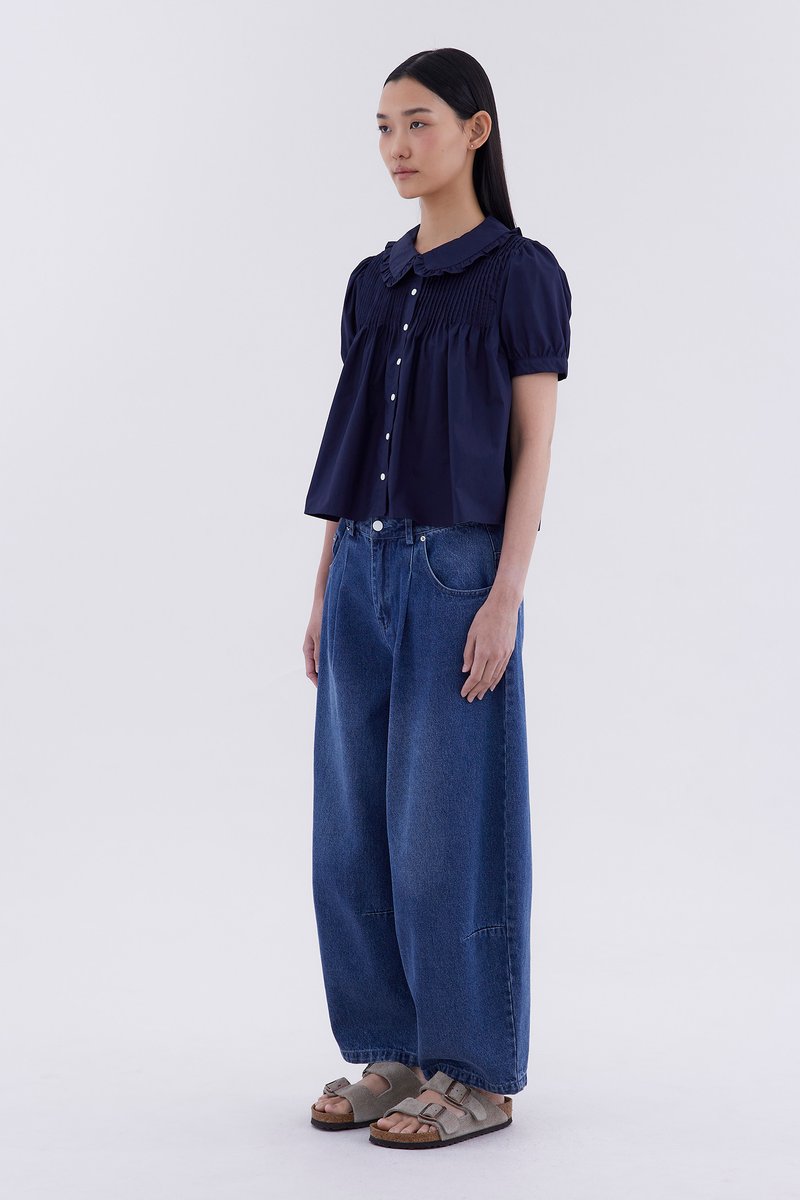 Volume up. Made from crisp and softly structured cotton, this shirt features a swishy, flared silhouette, pin-tuck pleats, a ruffle-trimmed collar, puffy short sleeves and a button-down front. Worn in a relaxed fit.