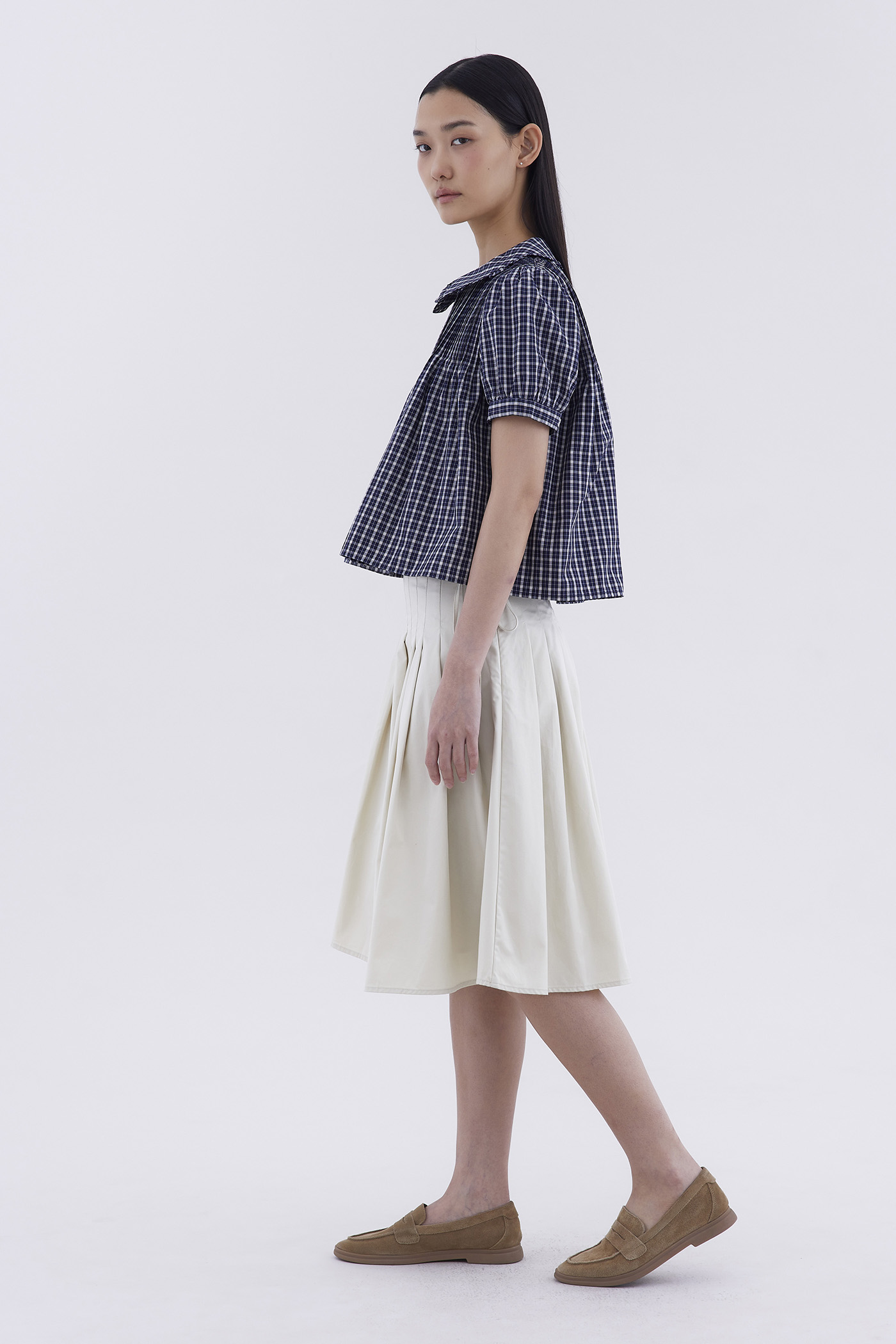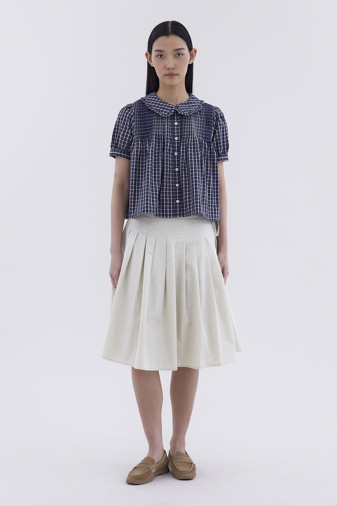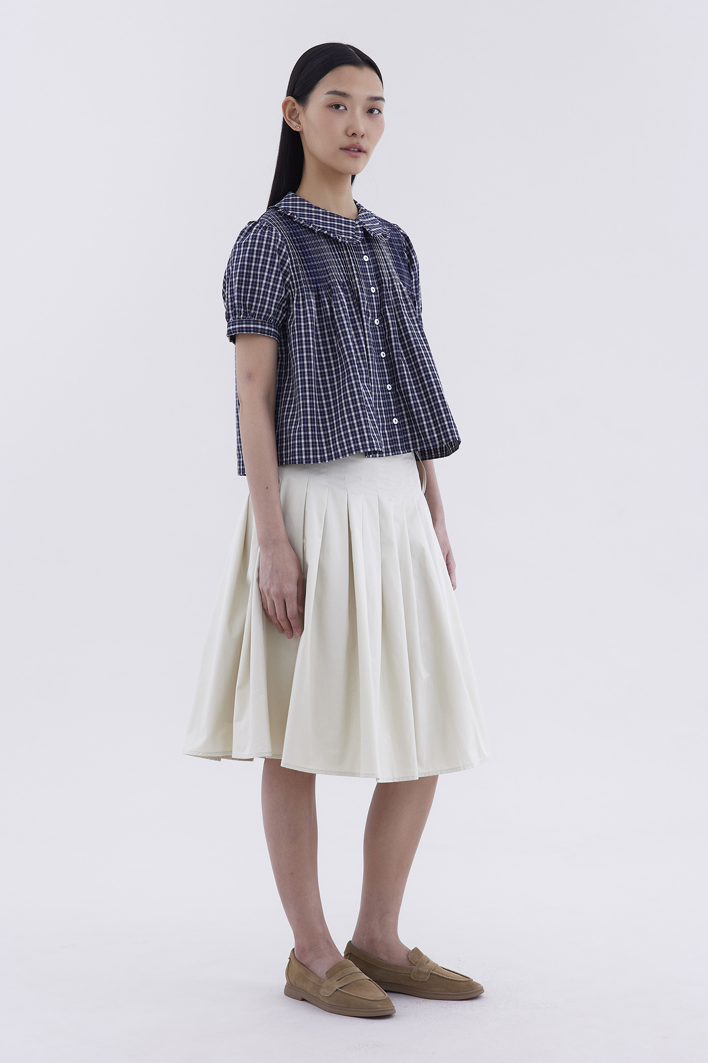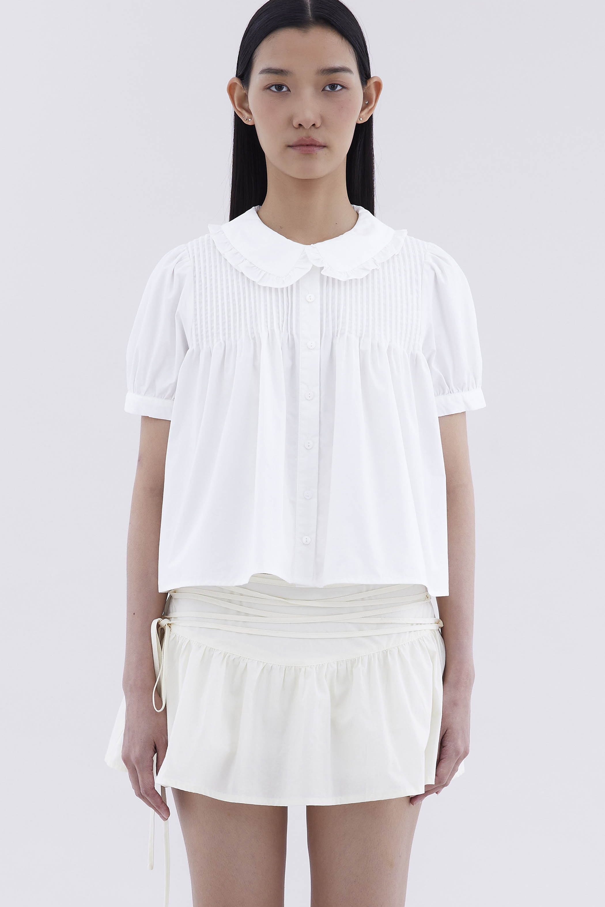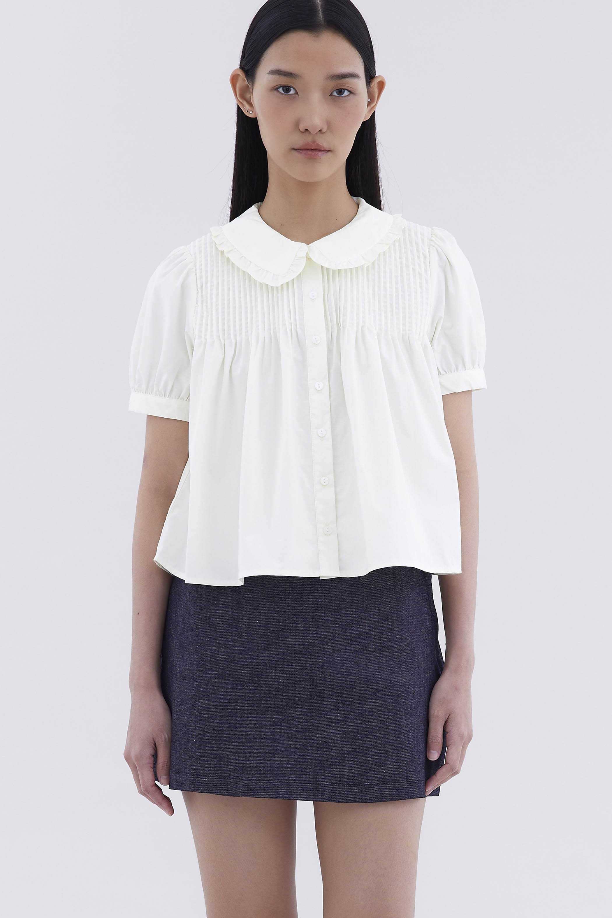 Volume up. Made from crisp and softly structured cotton, this shirt features a swishy, flared silhouette, pin-tuck pleats, a ruffle-trimmed collar, puffy short sleeves and a button-down front. Worn in a relaxed fit.